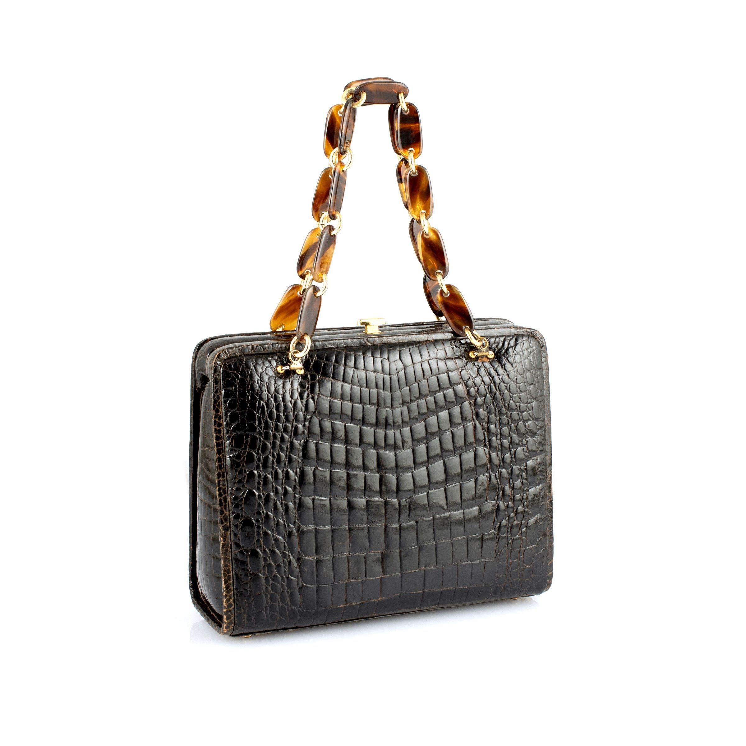 in pelle esotica marrone a due manici, finiture dorate e in bachelite, interno in pelle ad uno scomparto con tre tasche di cui una a zip