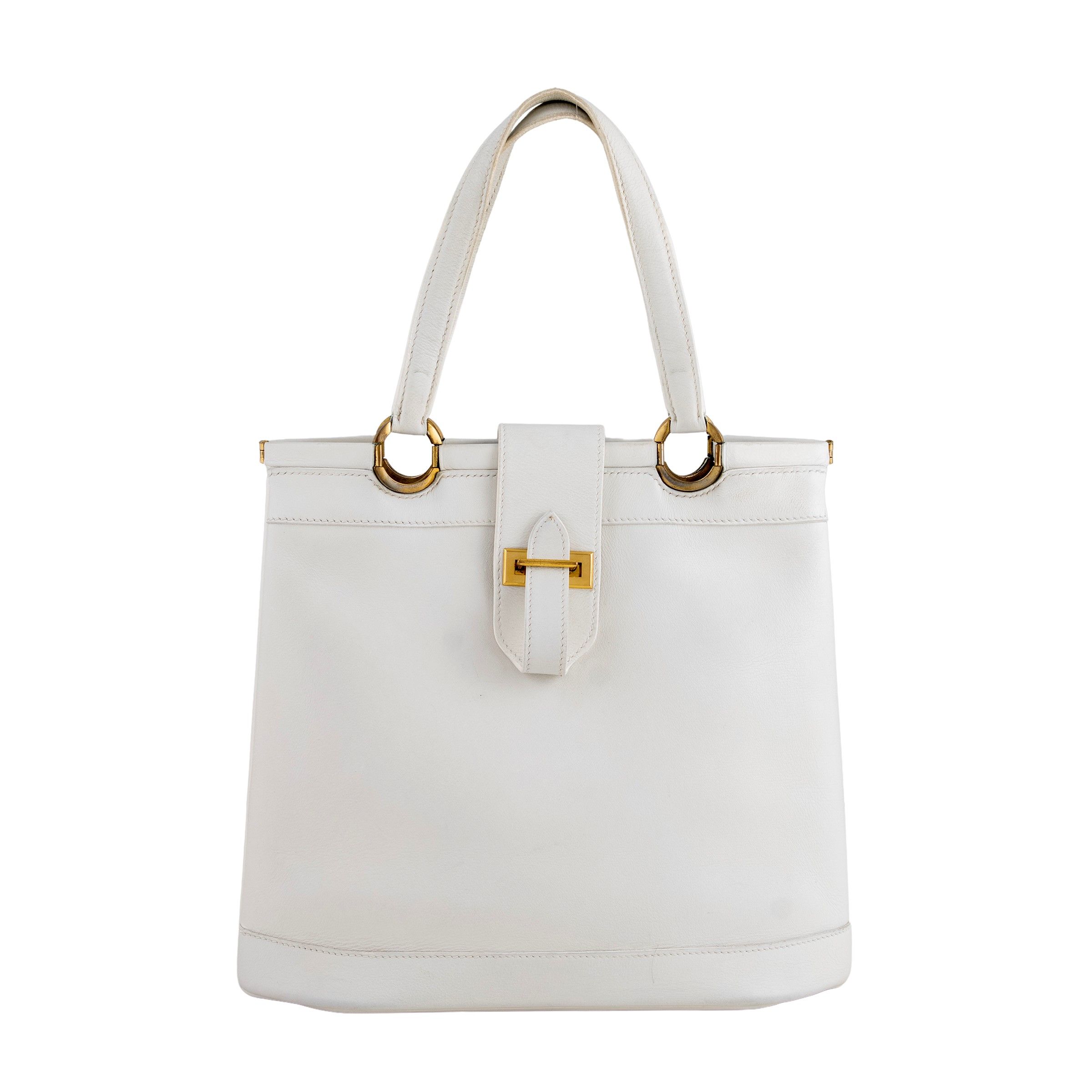 anni 70 circa in pelle bianca a due manici, finiture dorate, interno in tessuto ad uno scomparto con una tasca a zip, chiusura a fibbia, completa di dust bag