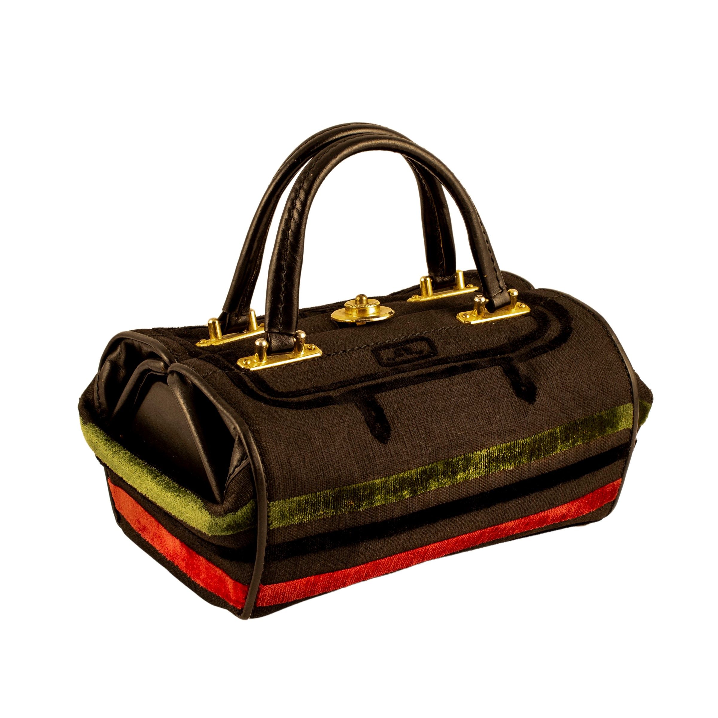 in tessuto e velluto multicolor a due manici in pelle, finiture dorate, interno in tessuto ad uno scomparto con due tasche di cui una a zip, chiusura a scatto