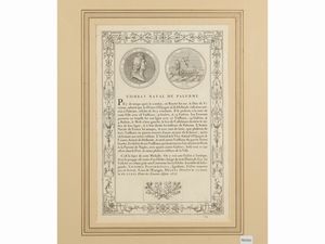 passe-partout cm 50,5x39,5 XIX secolo pagina con cornice architettonica, fregi e due medaglie incise (Ludocicus [..]