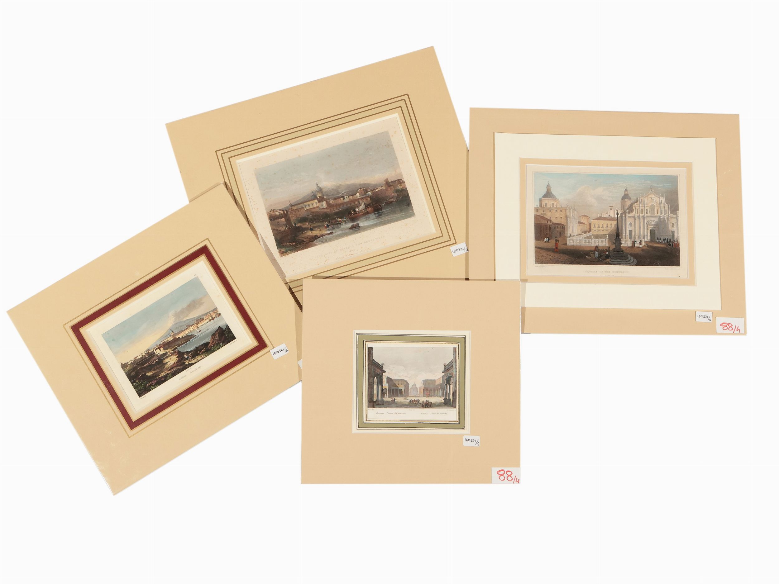 XIX secolo quattro incisioni su acciaio, colorate, con passe-partout, tracce di foxing