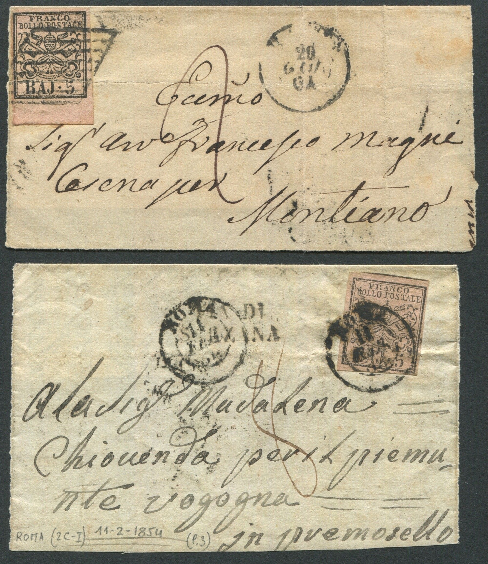1852, Stato Pontificio, 5 baj rosa chiaro (6), I emissione, frammenti per Montiano [..]
