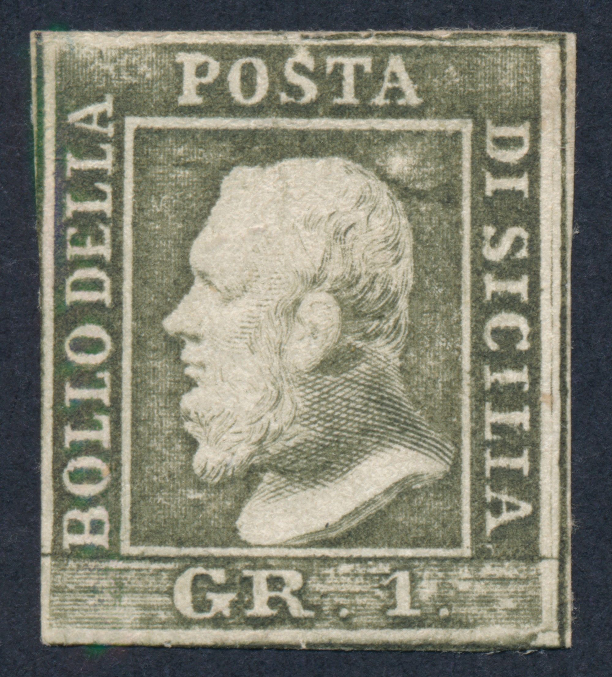 1859, Sicilia, 1 grano oliva grigiastro (4e), II tavola, carta di Napoli, nuovo [..]