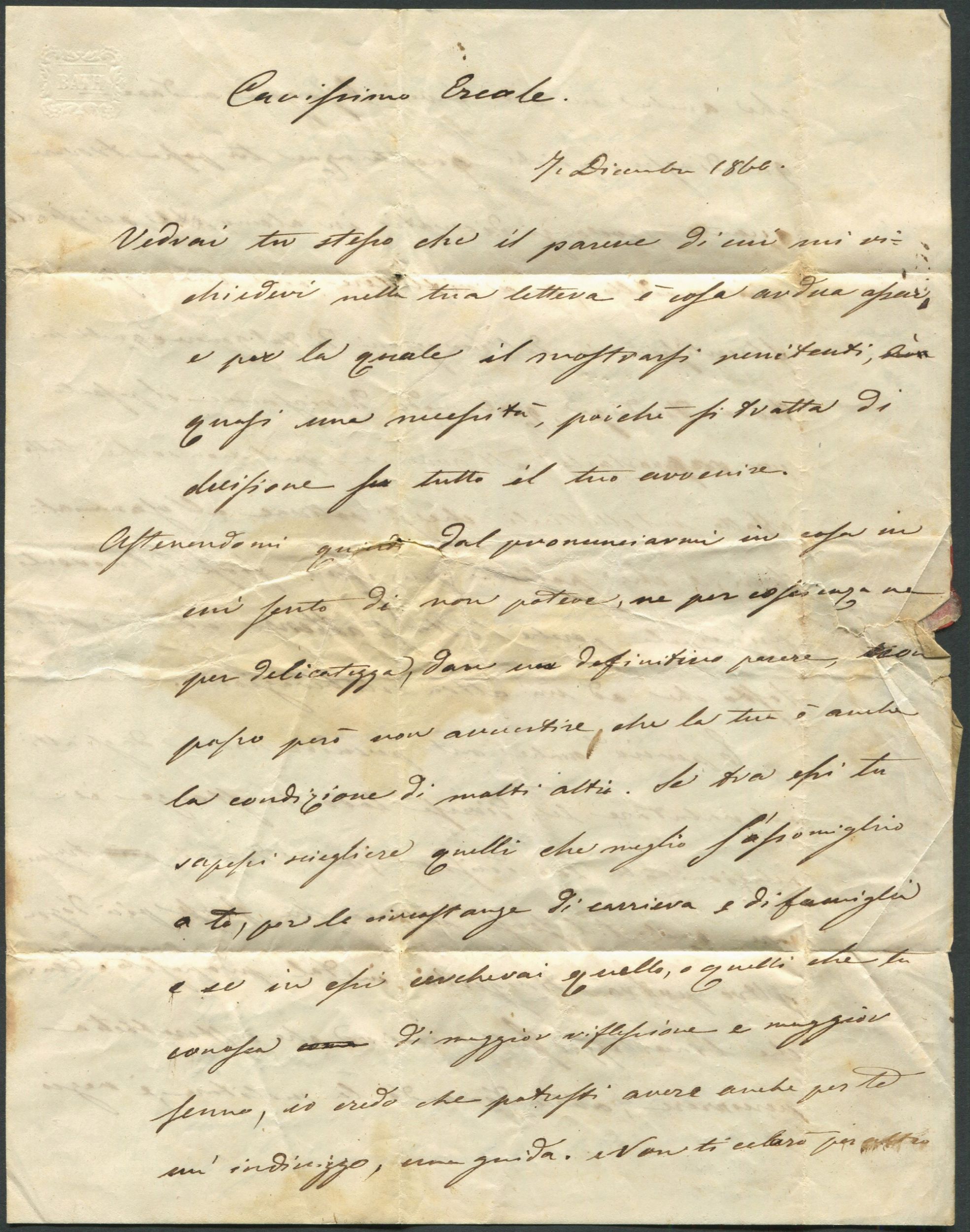 Lettera di 1° porto non affrancata spedita da Pavia il 7 dicembre 1860 per Caserta e indirizzata ad Ercole Boretti (Di Pavia), volontario garibladino, Sottotenente della Brigata Garibaldina Eber, 1° Reggimento, 2° Battaglione, 3a. Compagnia. Eccezionale documento della storia d’Italia.Ferdinand Eber giunse in Sicilia come corrispondente del Times per cui lavorava dall'epoca della guerra in Crimea. Dopo aver fornito a Garibaldi informazioni utili sullo schieramento borbonico all'interno della città di Palermo, il 16 maggio 1860, partecipò alla formazione della legione ungherese. Questa inizialmente contava 50 uomini che arrivarono a essere 500 volontari. La Brigata, denominata Eber, racchiuse tutti i combattenti stranieri e fu guidata da Eber con il grado di colonnello brigadiere e dal tenente colonnello Lajos Tukory, che cadde a Palermo il 29 maggio 1860. Passata al comando di Stefano Turr, divenuto in quei mesi governatore di Napoli, fu utilizzata per reprimere focolai di rivolta in provincia di Avellino, fino al Plebiscito.