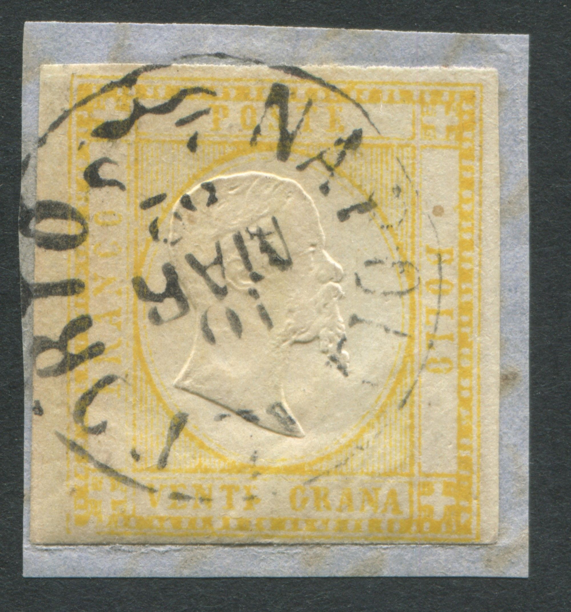 1862, Province Napoletane, 20 grana giallo (23) su piccolo frammento con annullo [..]