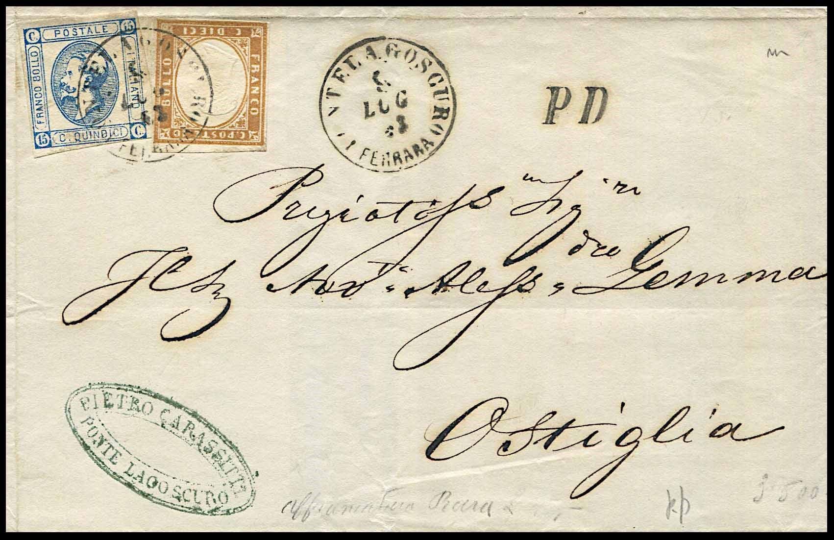 1863, Regno d’Italia, lettera da Pontelagoscuro per Ostiglia del 9 luglio 1863