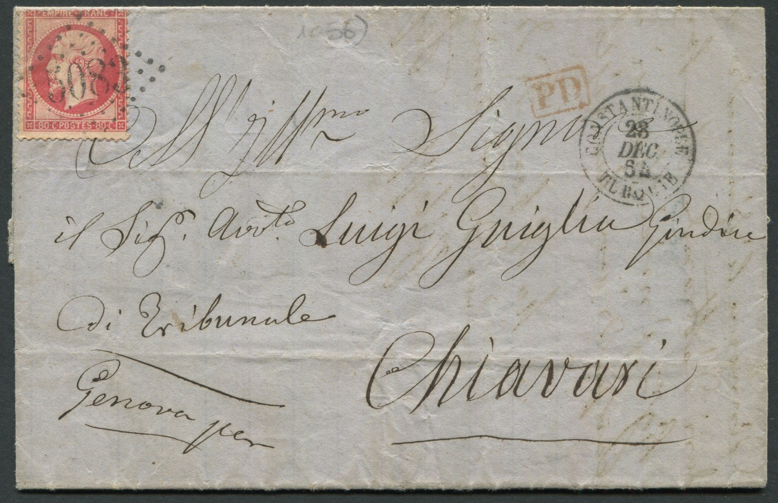1864, Levante francese, Lettera da Costantinopoli a Chiavari con 80c. carminio “Napoleone [..]