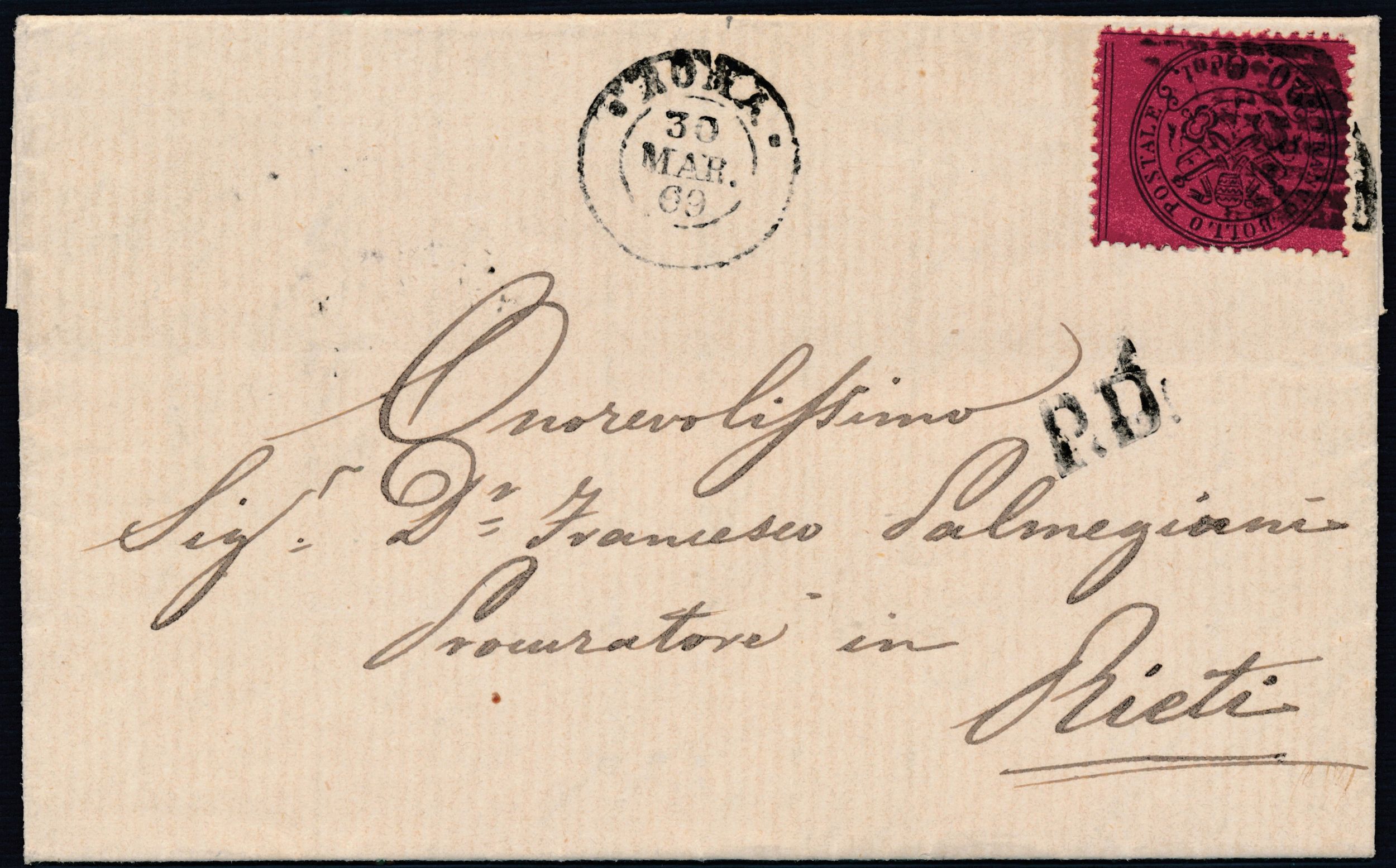 1869, Stato Pontificio, 20c. solferino (28) , III emissione, su lettera da Roma [..]