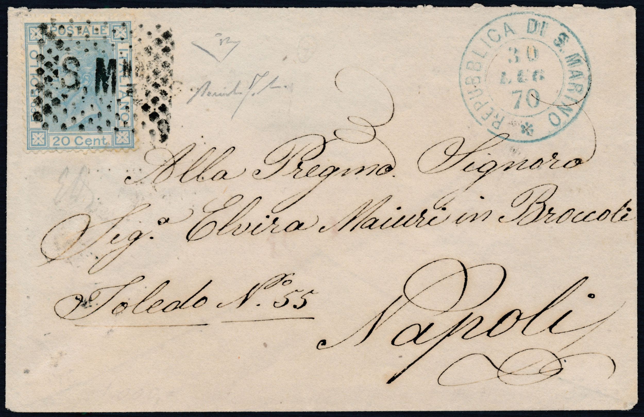 1870, S. Marino, Precursori, bustina per Napoli del 30 luglio 1870, affrancata con [..]
