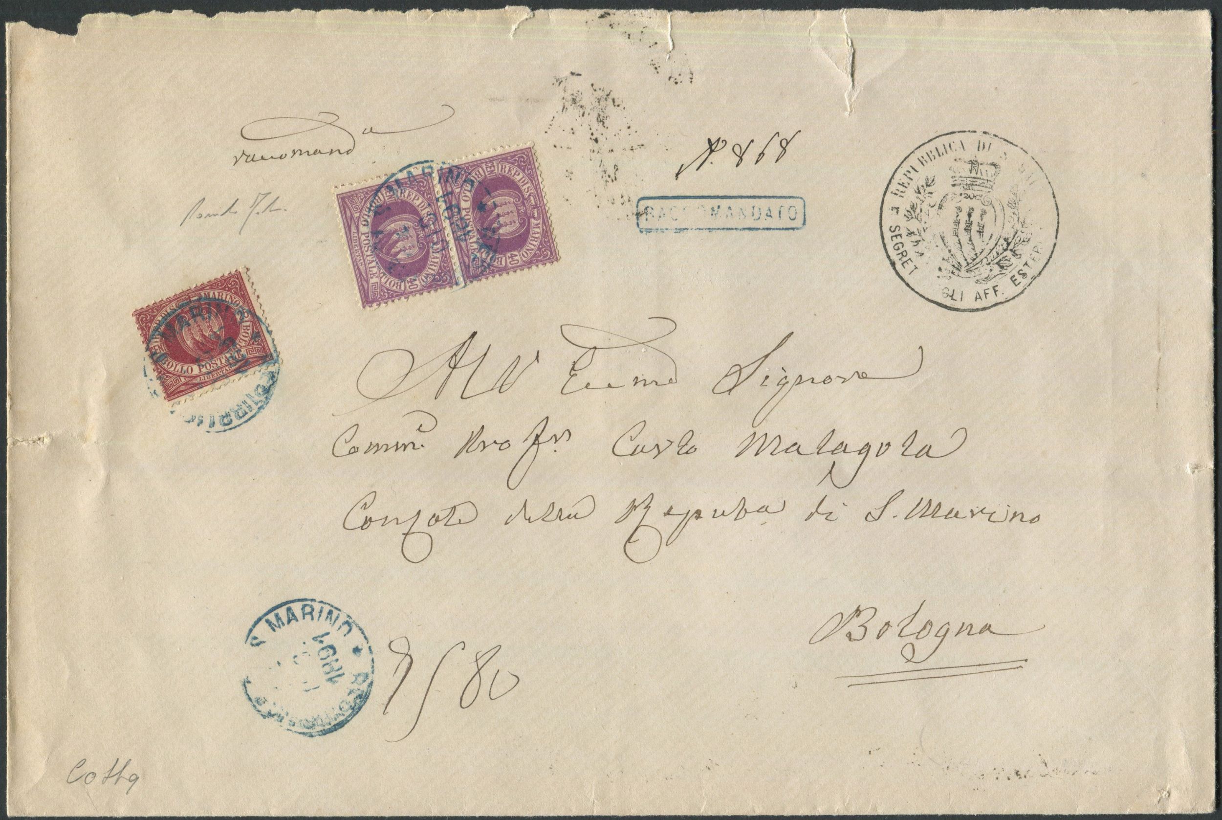 1891, S.Marino, Grande busta raccomandata per Bologna del 24 dicembre 1891, affrancata [..]