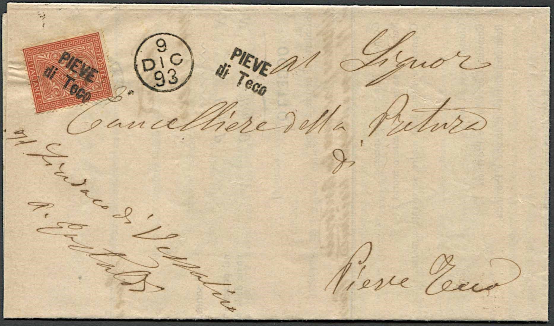 1893, Regno d'Italia, Collettorie, lettera in franchigia da Pieve di Teco (IM) per [..]