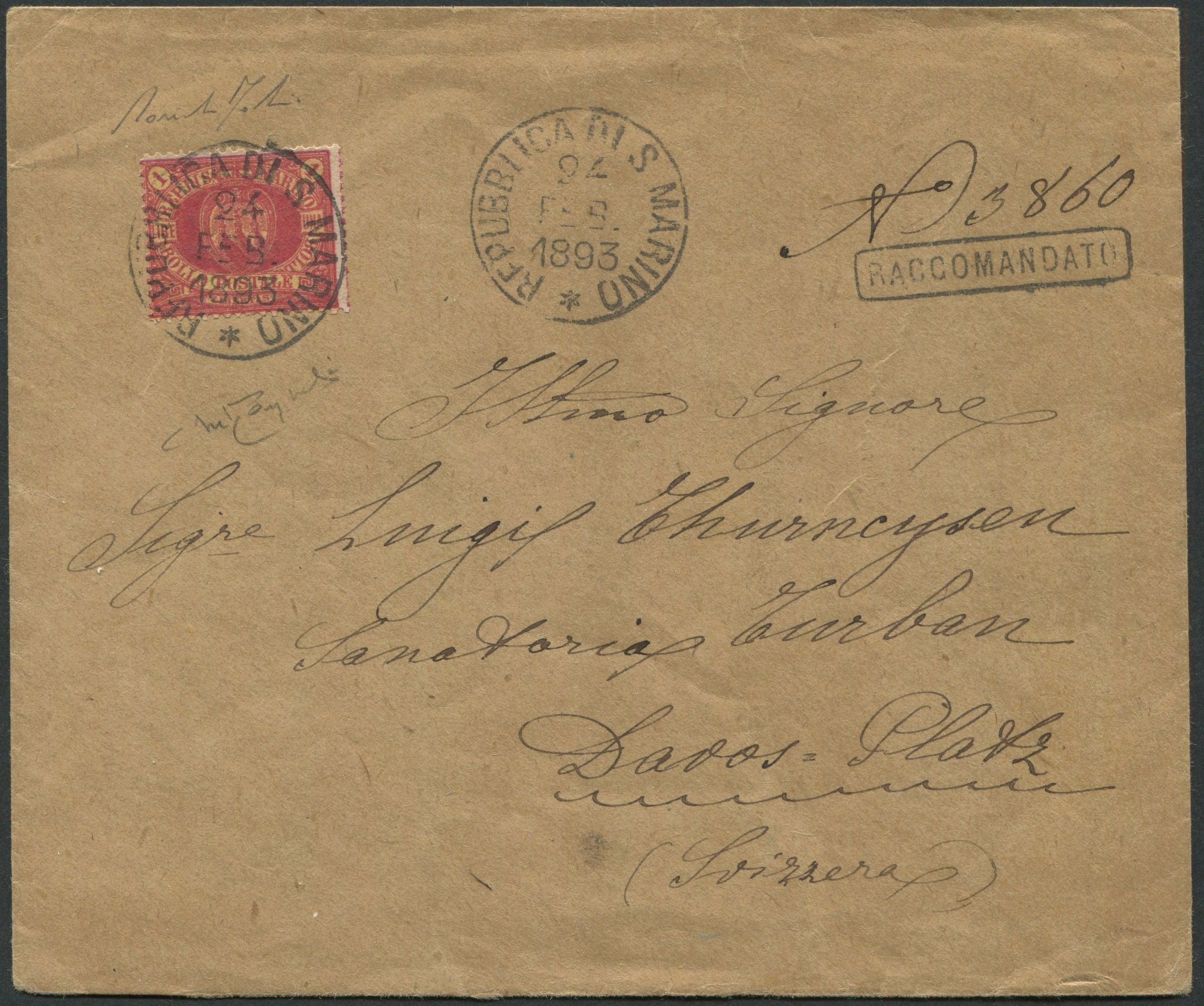 1893, S.Marino, Raccomandata per Davos Platz affrancata con 1 lira carminio su giallo [..]
