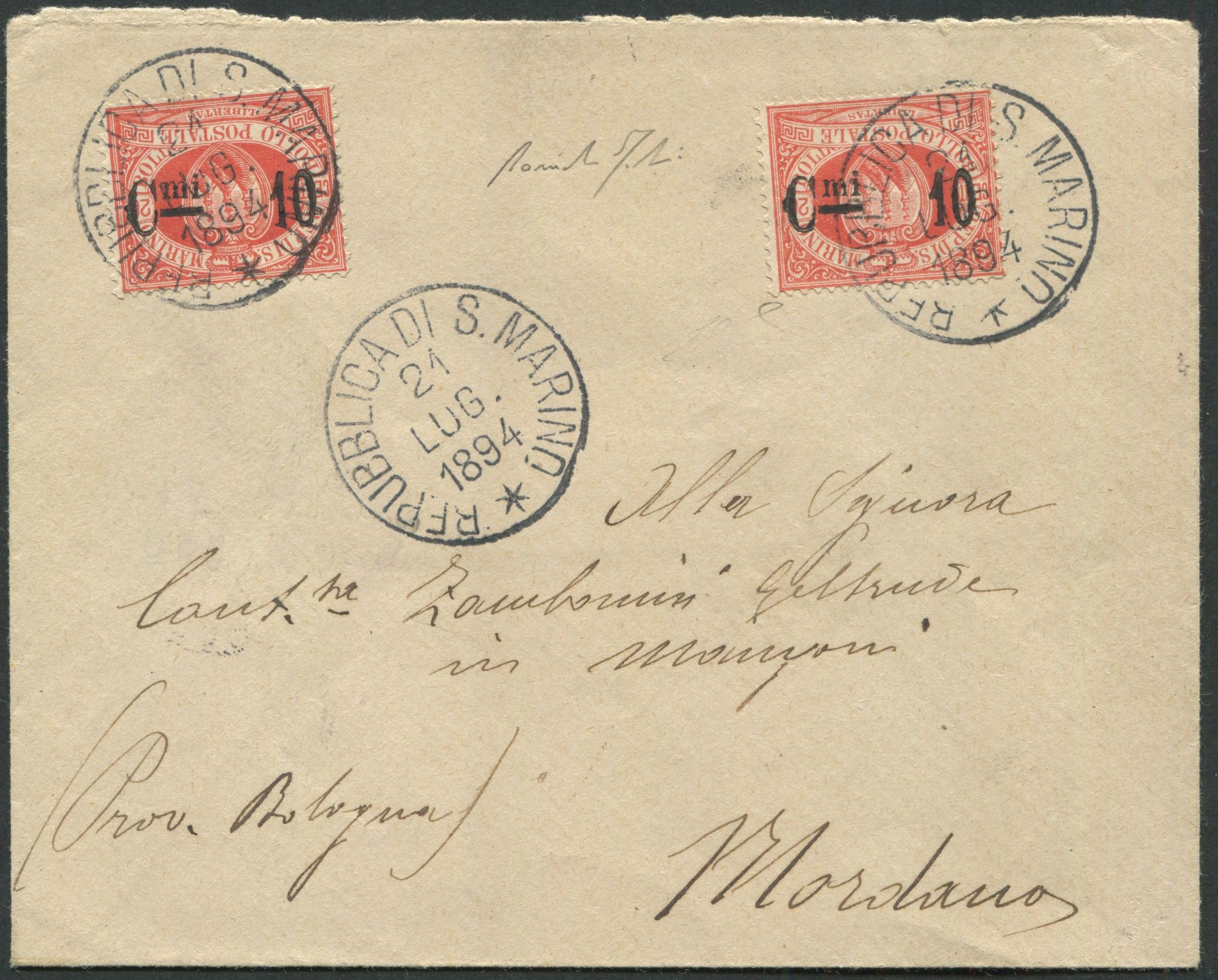 1894, S. Marino, busta per Mordano (BO), affrancata con due es. del 20c. rossi con [..]