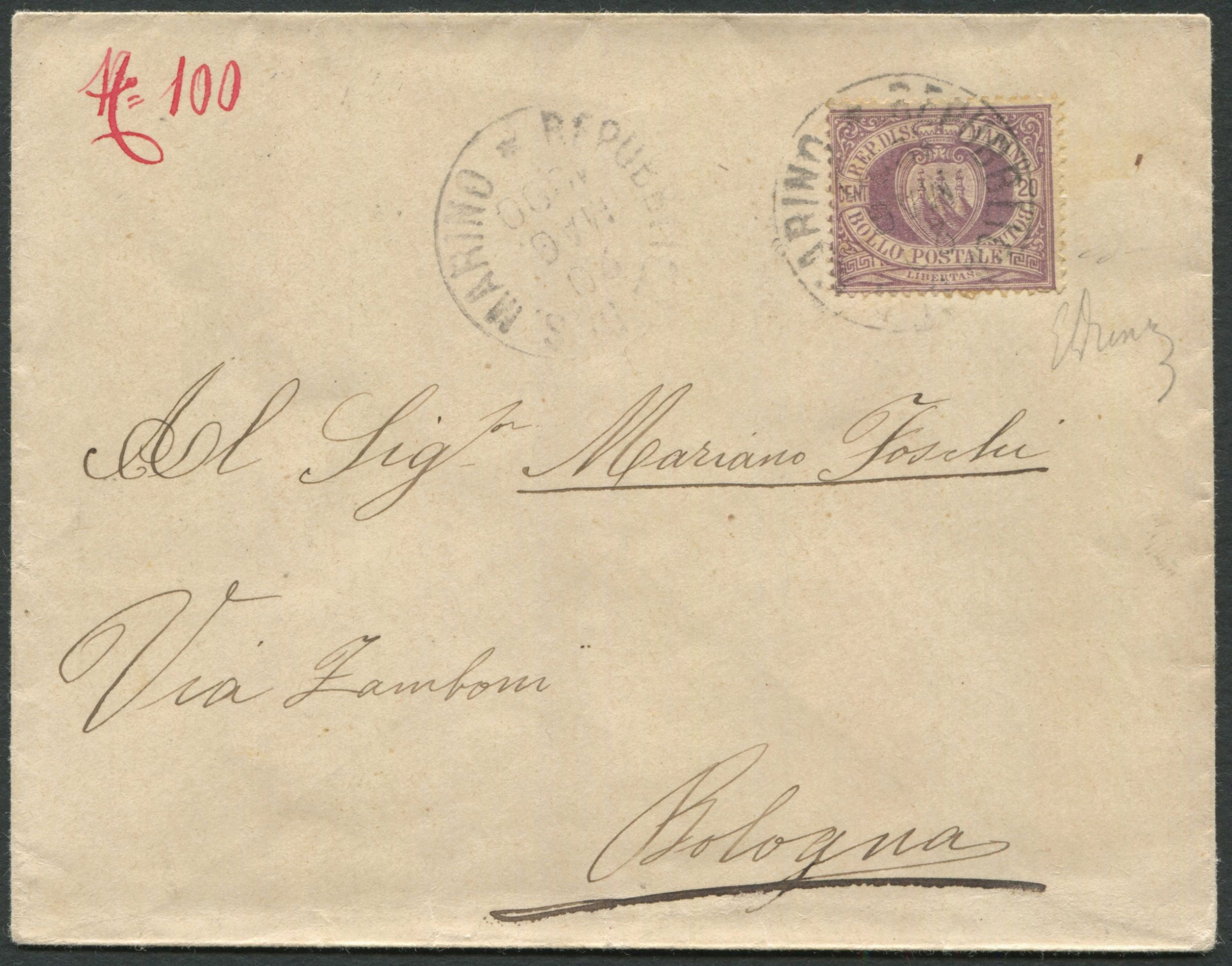 1900, S.Marino, Busta per Bologna affrancata con 20 cent. lilla (29)