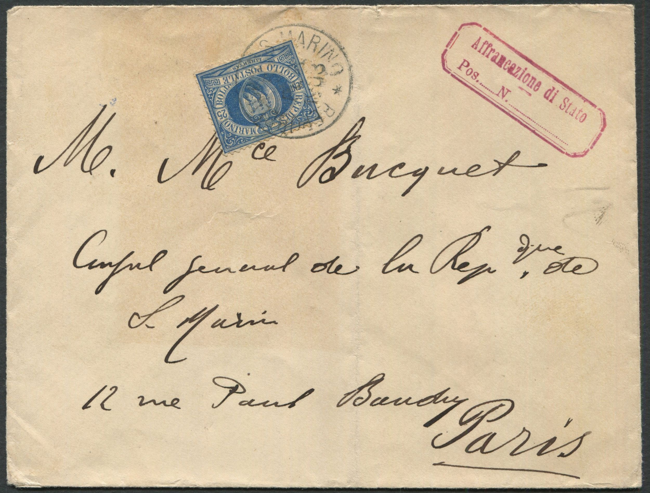 1903, S.Marino, Busta per il Console Generale di S. Marino a Parigi, affrancata [..]