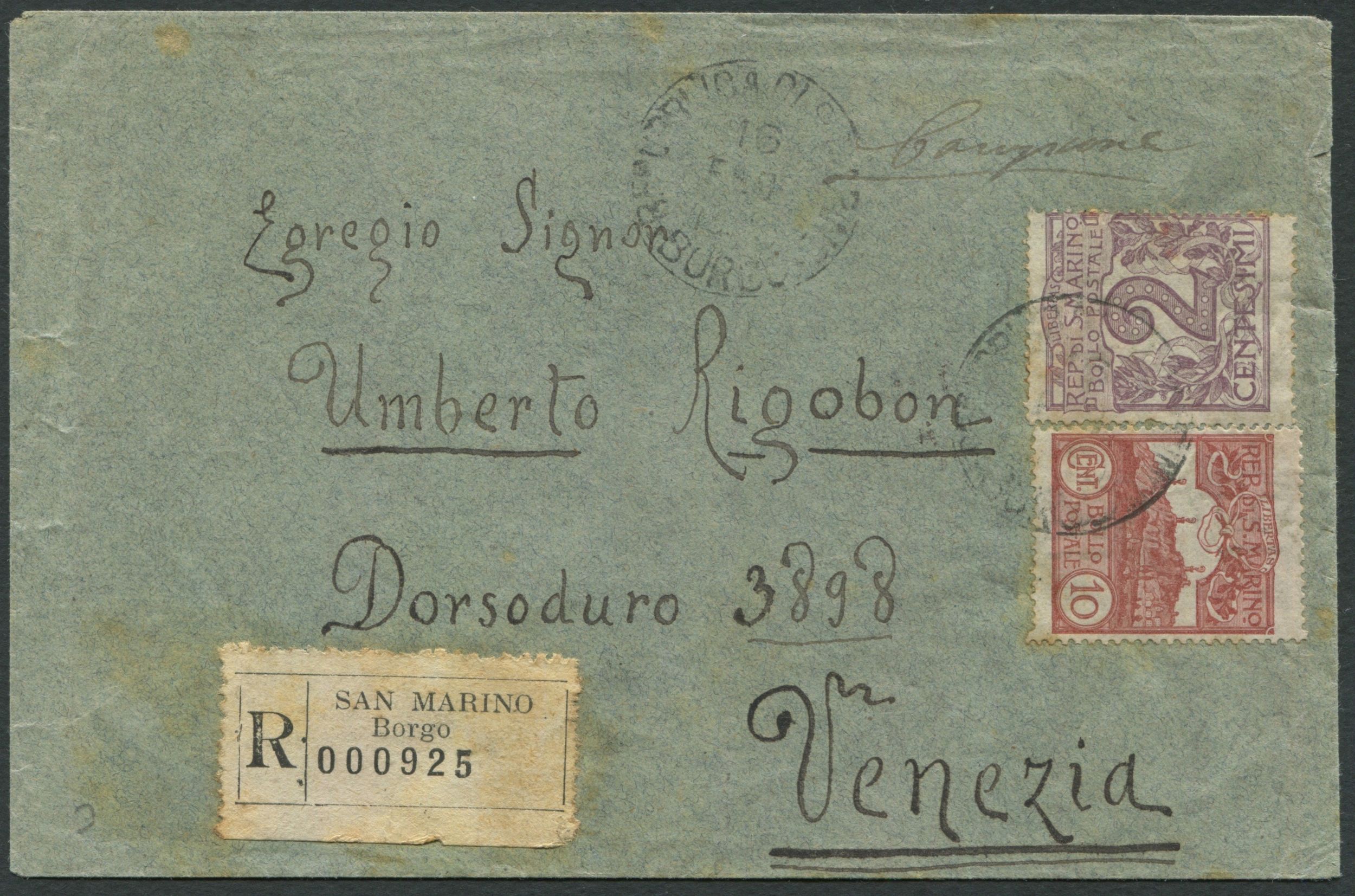 1905, S.Marino, Campione senza valore racc. da Borgo S. Marino a Venezia affrancato [..]
