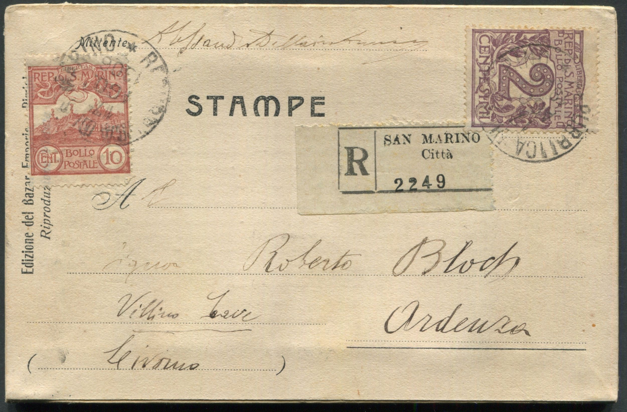 1906 - San Marino - Stampe raccomandate affr. 2c. + 10c.
