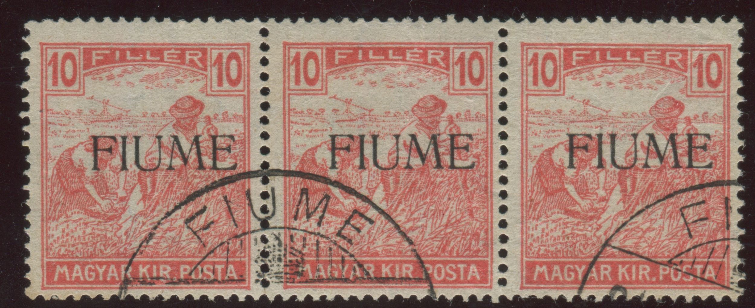 1918, Fiume, serie “Mietitori”, 10 filler carminio striscia di tre usata.