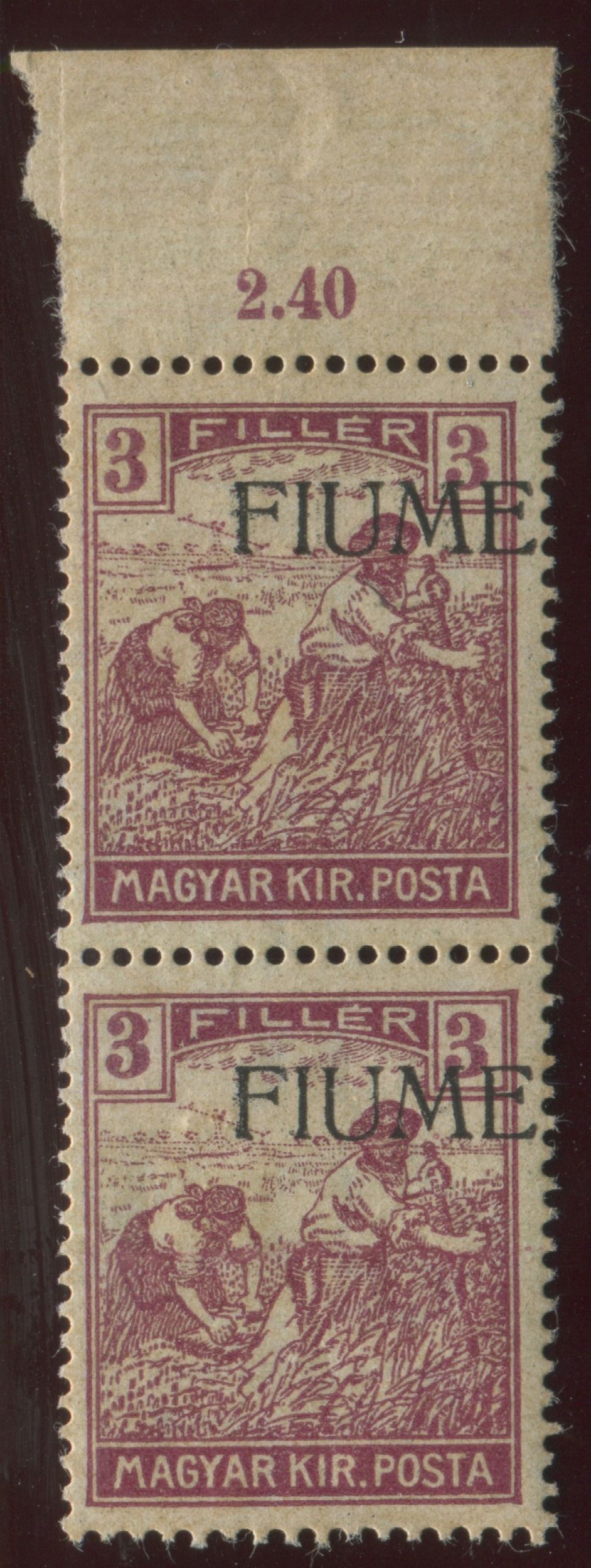 1918, Fiume, serie “Mietitori”, 3 filler lilla violetto coppia bdf, Varietà soprastampa [..]