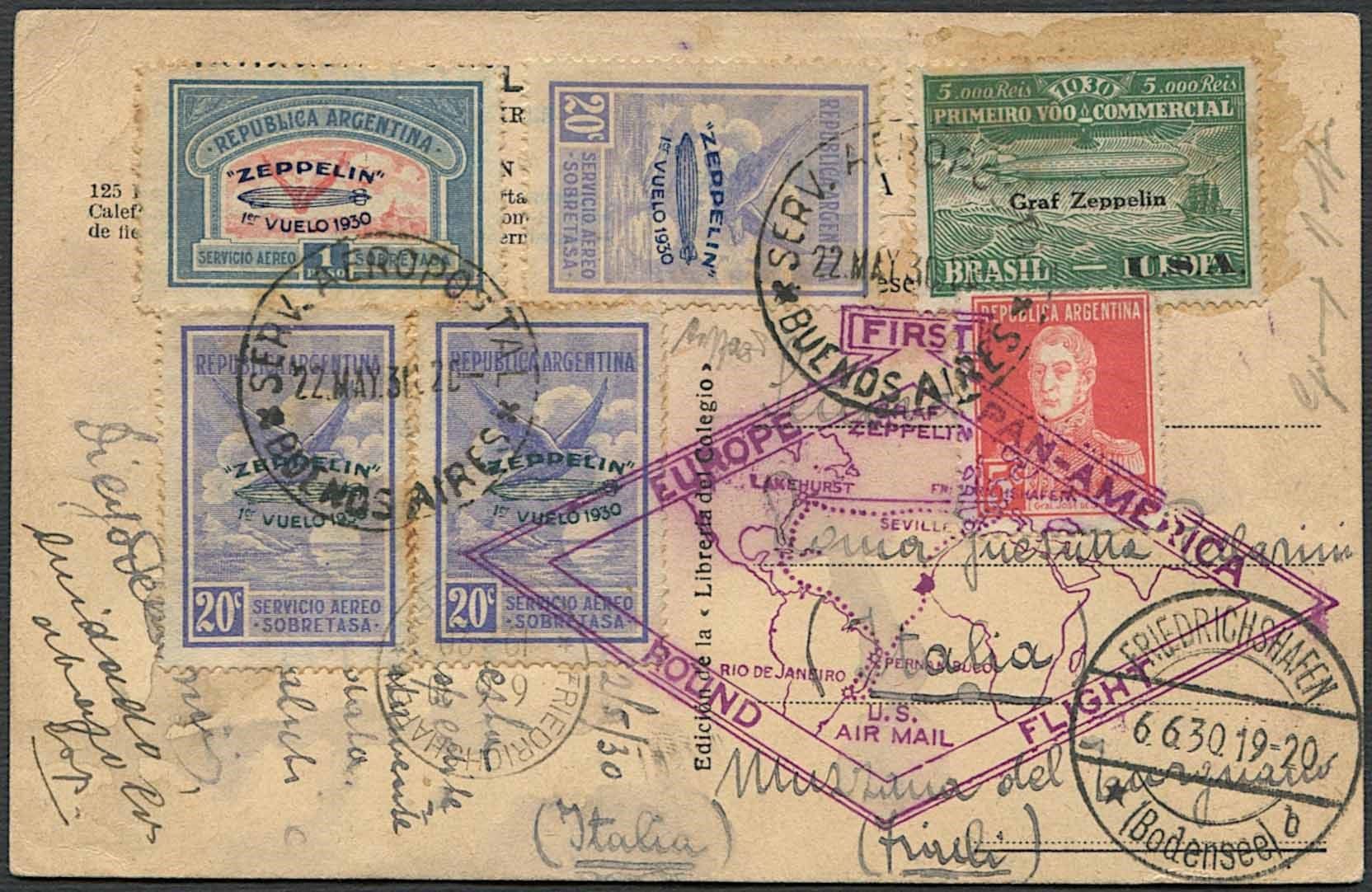 1930, Argentina, Zeppelin, cartolina illustrata spedita via zeppelin da Buenos Aires [..]