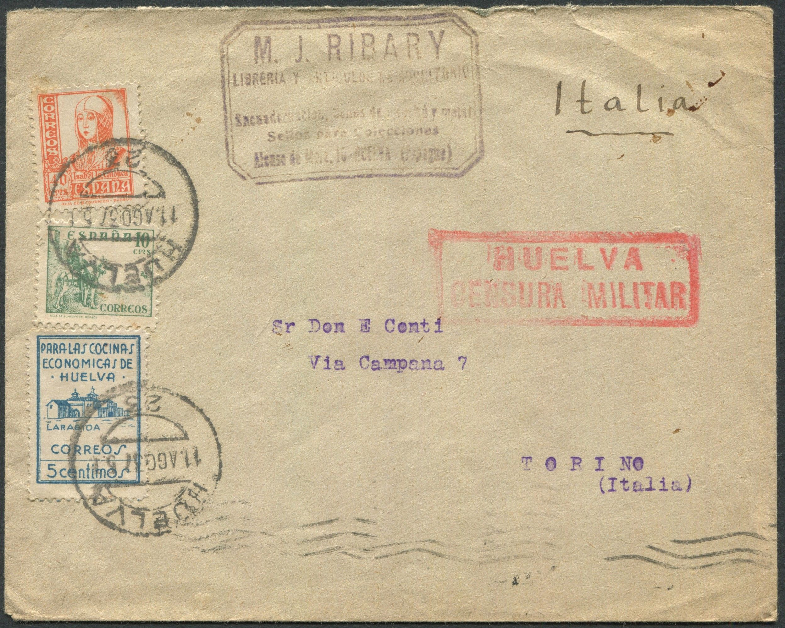 1937, Spagna, Busta da Huelva per Torino, affrancata con 40 cent. arancio (Yv. 584), [..]