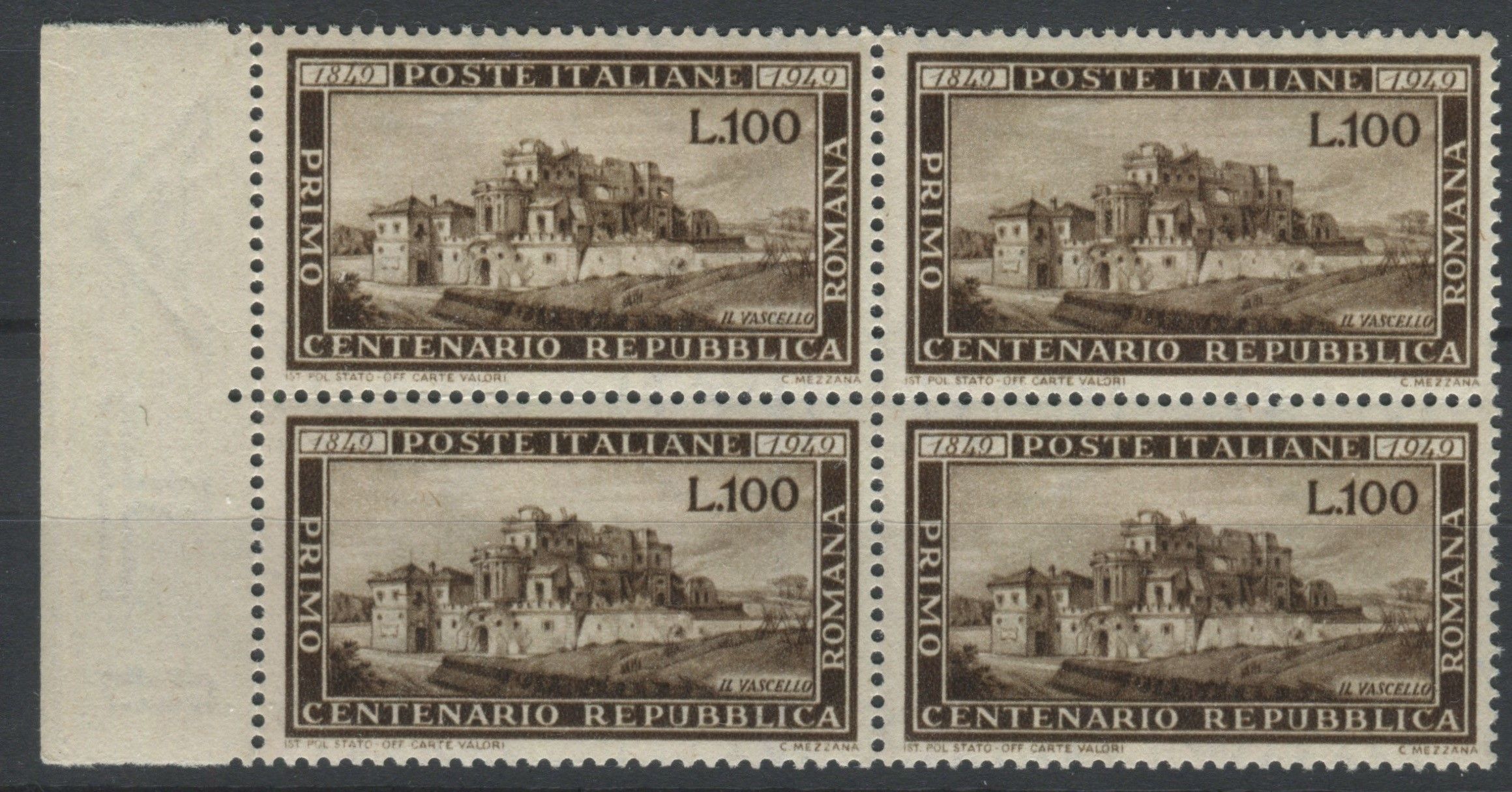 1949, Repubblica italiana, 100 lire Rep. Romana, quartina bdf (600)