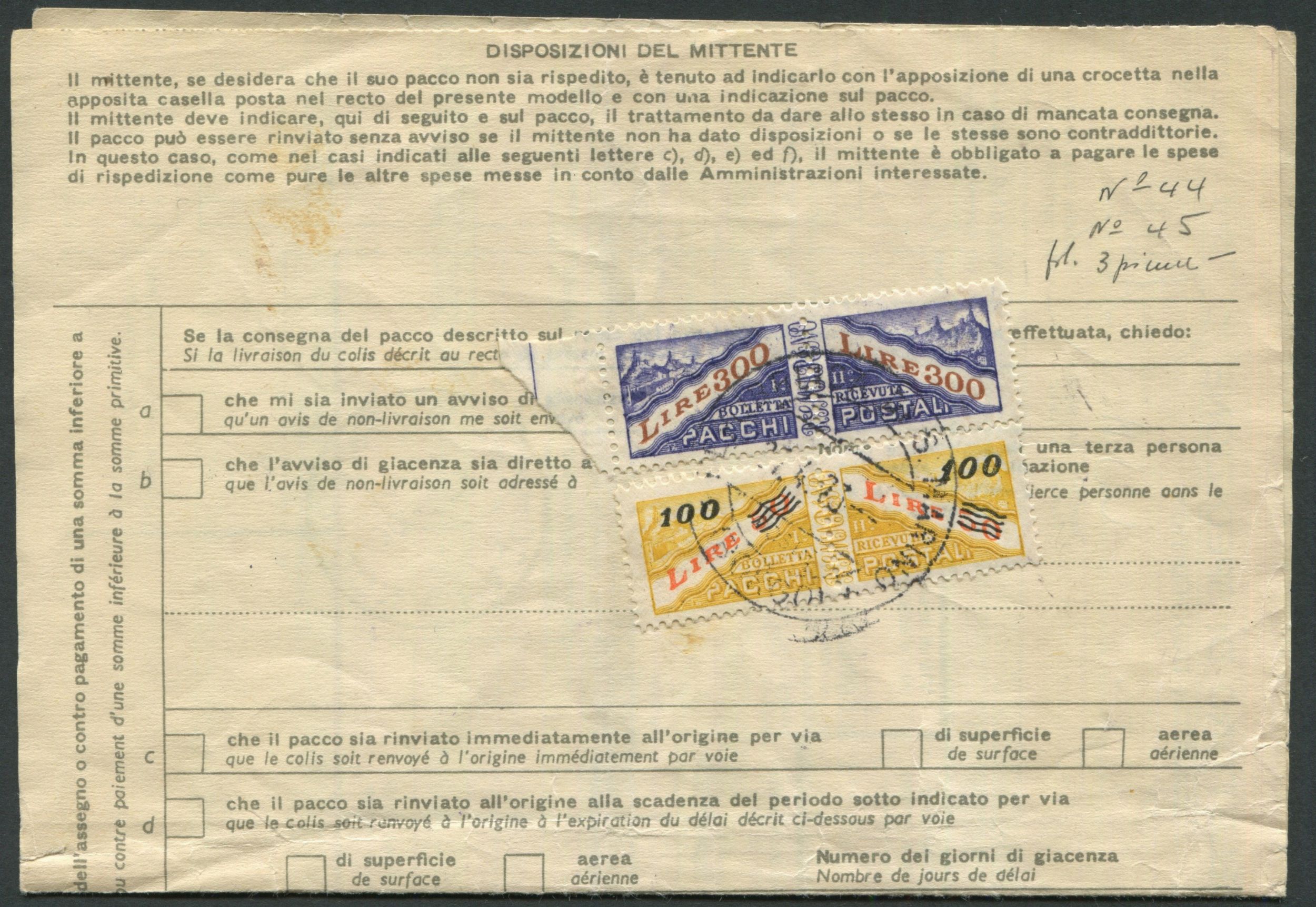 1973, S.Marino, Bollettino di spedizione dagli USA a S.Marino con francobolli per [..]