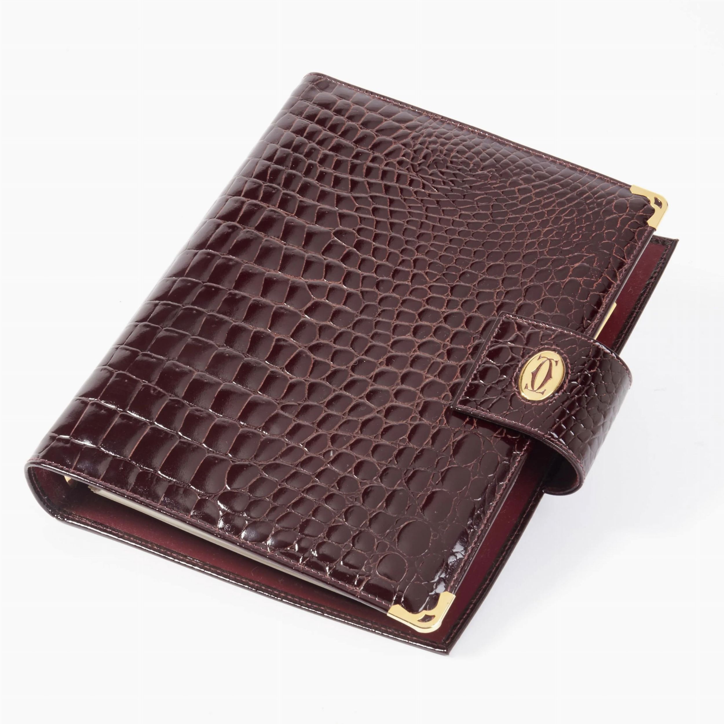 Un pezzo che arricchisce qualsiasi scrivania, agenda in coccodrillo bordeaux dalle squame perfette, con interno in pelle organizzato, angoli in oro come il logo presente sul laccio di chiusura.