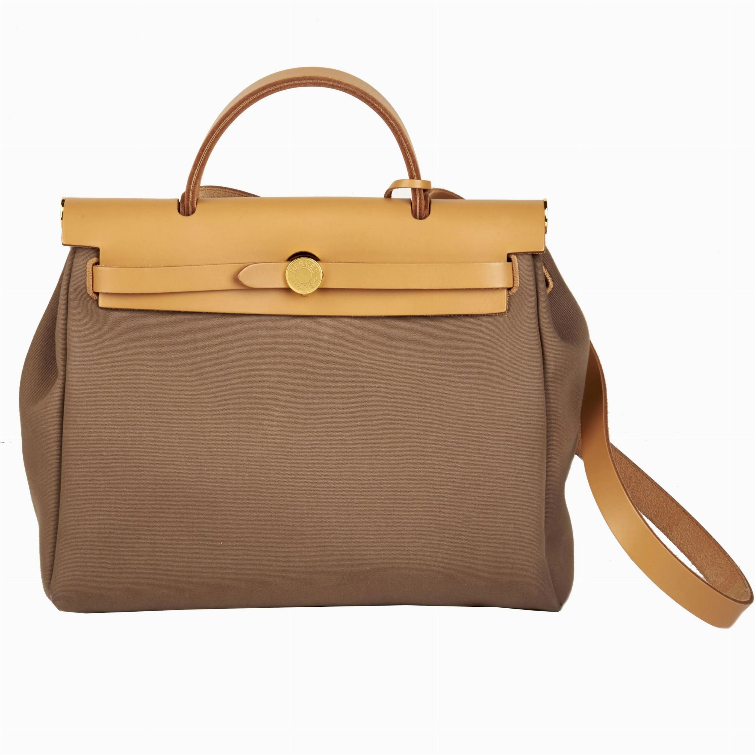 Una perfetta borsa per l'utilizzo quotidiano in tela Hunter color taupe e patta superiore in vacchetta come il manico e la tracolla.Ha una tasca posteriore esterna chiusa con zip e un pouch interno. Accessori in ottone dorato con logo Hermes per un lusso soft.