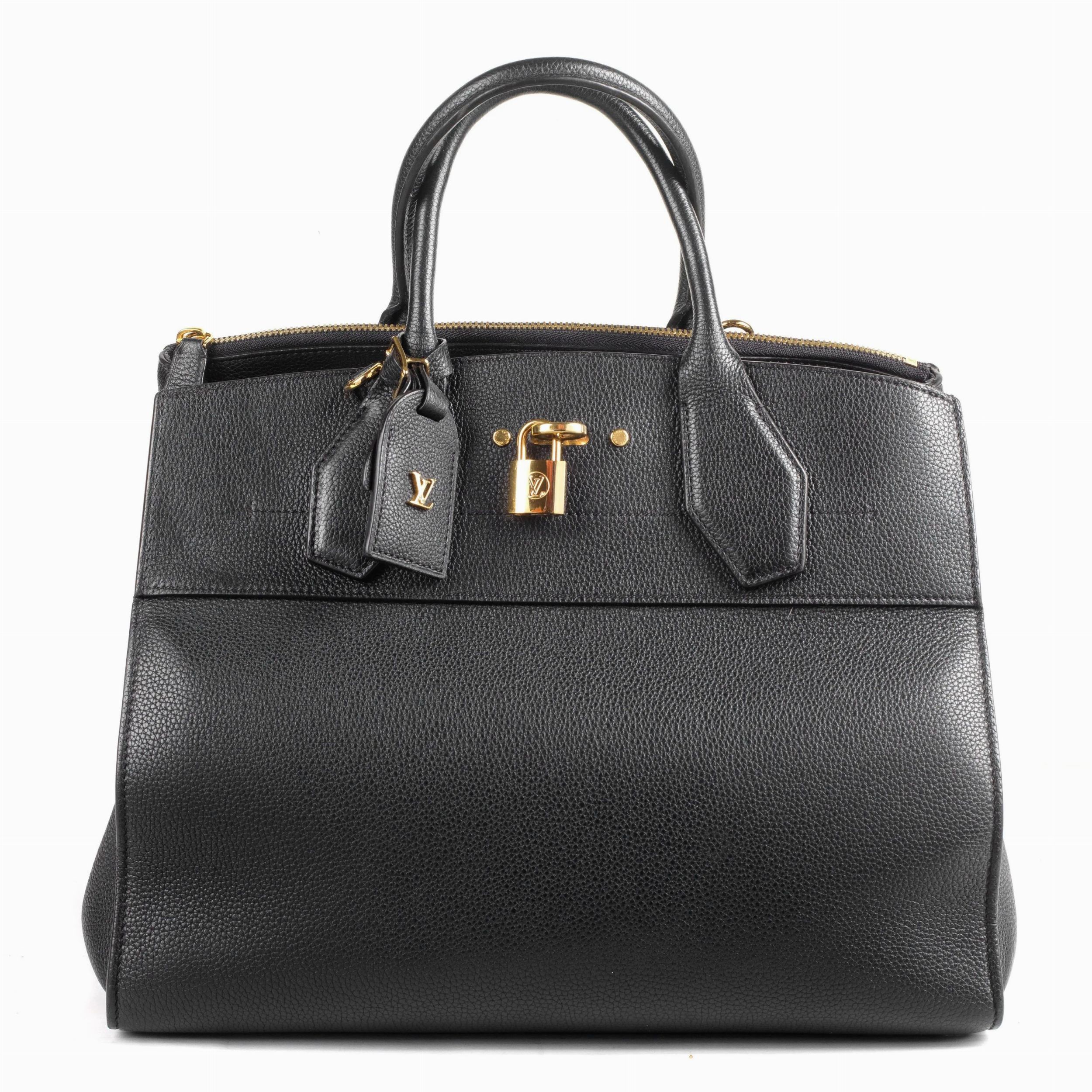 Bellissima borsa Louis Vuitton City Steamer in pelle martellata nera, inserti in metallo dorato, doppio manico in pelle martellata nera, una chiusura con moschettone, fodera interna in pelle nera, 3 scomparti di cui uno con zip. Corredata di targhetta e dustbag originali