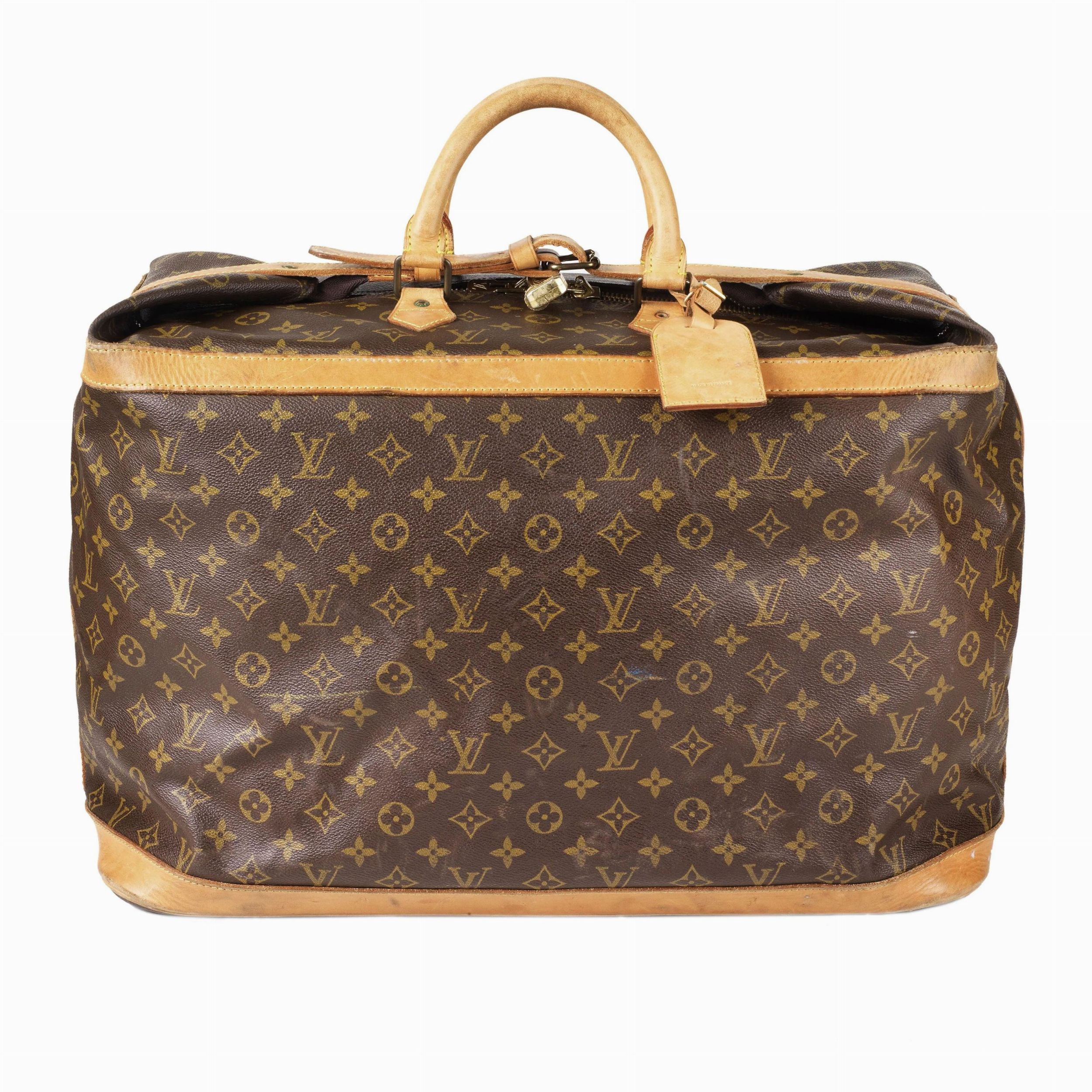 Particolare modello di sacca morbida da viaggio con base rettangolare semirigida con piedini in ottone e corpo borsa in tela Monogram morbido con dettagli di rinforzo in vacchetta. Chiusura superiore con zip e laccio in vacchetta a chiudere con ardiglione.Doppio manico in vacchetta.