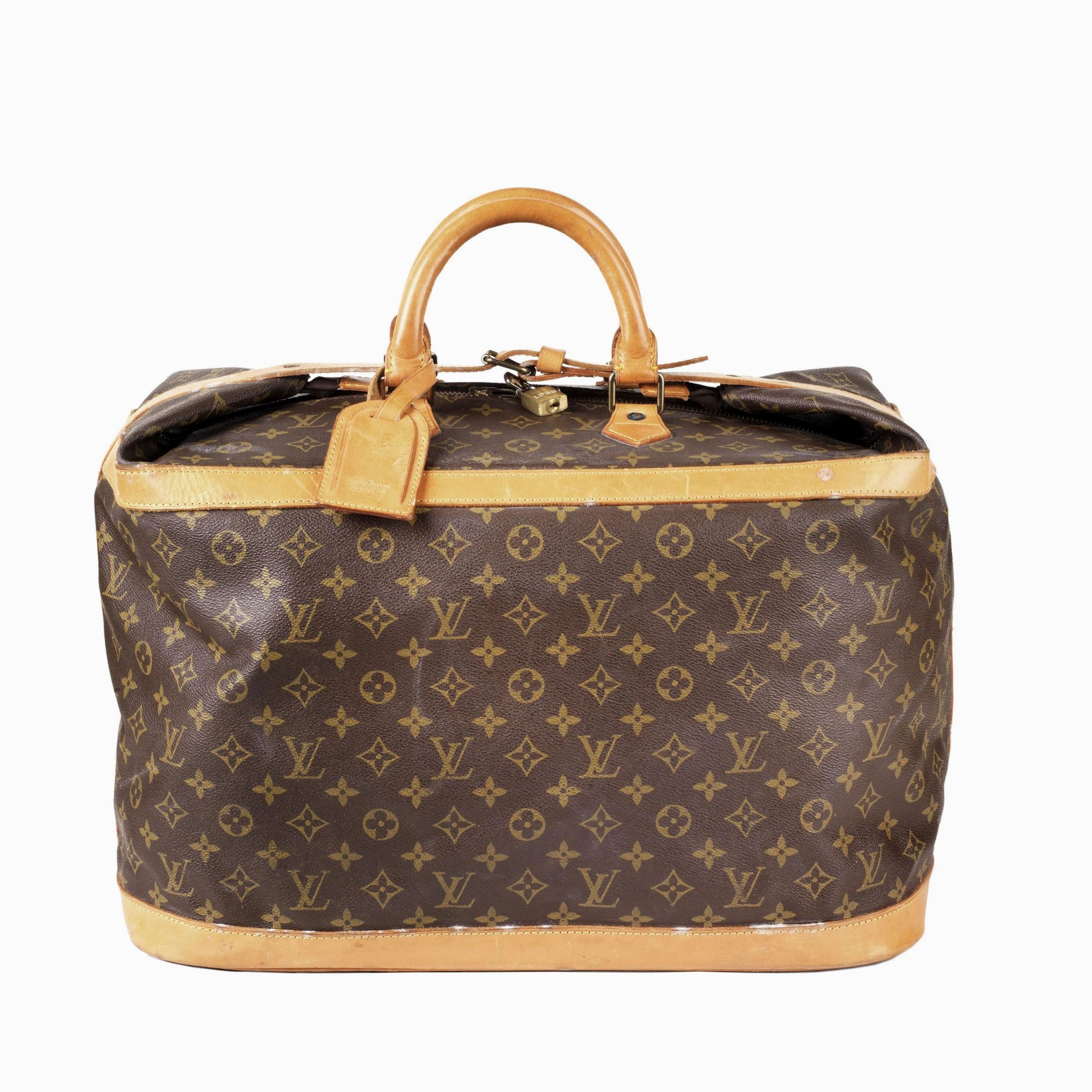 Particolare modello di sacca morbida da viaggio con base rettangolare semirigida con piedini in ottone e corpo borsa in tela Monogram morbido con dettagli di rinforzo in vacchetta. Chiusura superiore con zip e laccio in vacchetta a chiudere con ardiglione.Doppio manico in vacchetta.