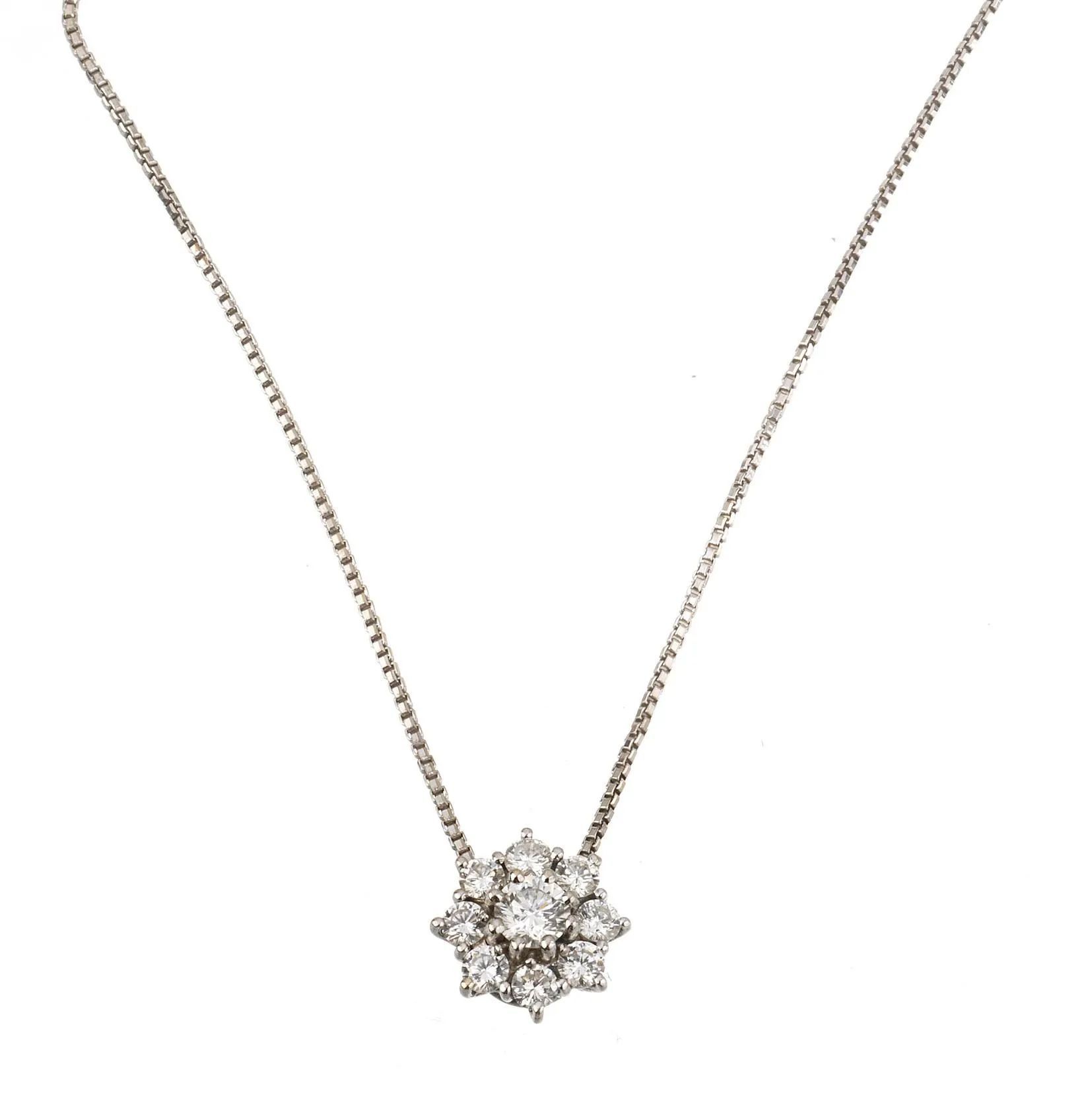 in oro bianco 18kt, pendente a forma di fiore impreziosito da diamanti taglio brillante per ct 0.60 circa, punzone 750, lungh. cm 40, dim. pendente cm 1x1, gr. 3. Corredato di certificato di garanzia Conti Gioielli del 4/04/2002.