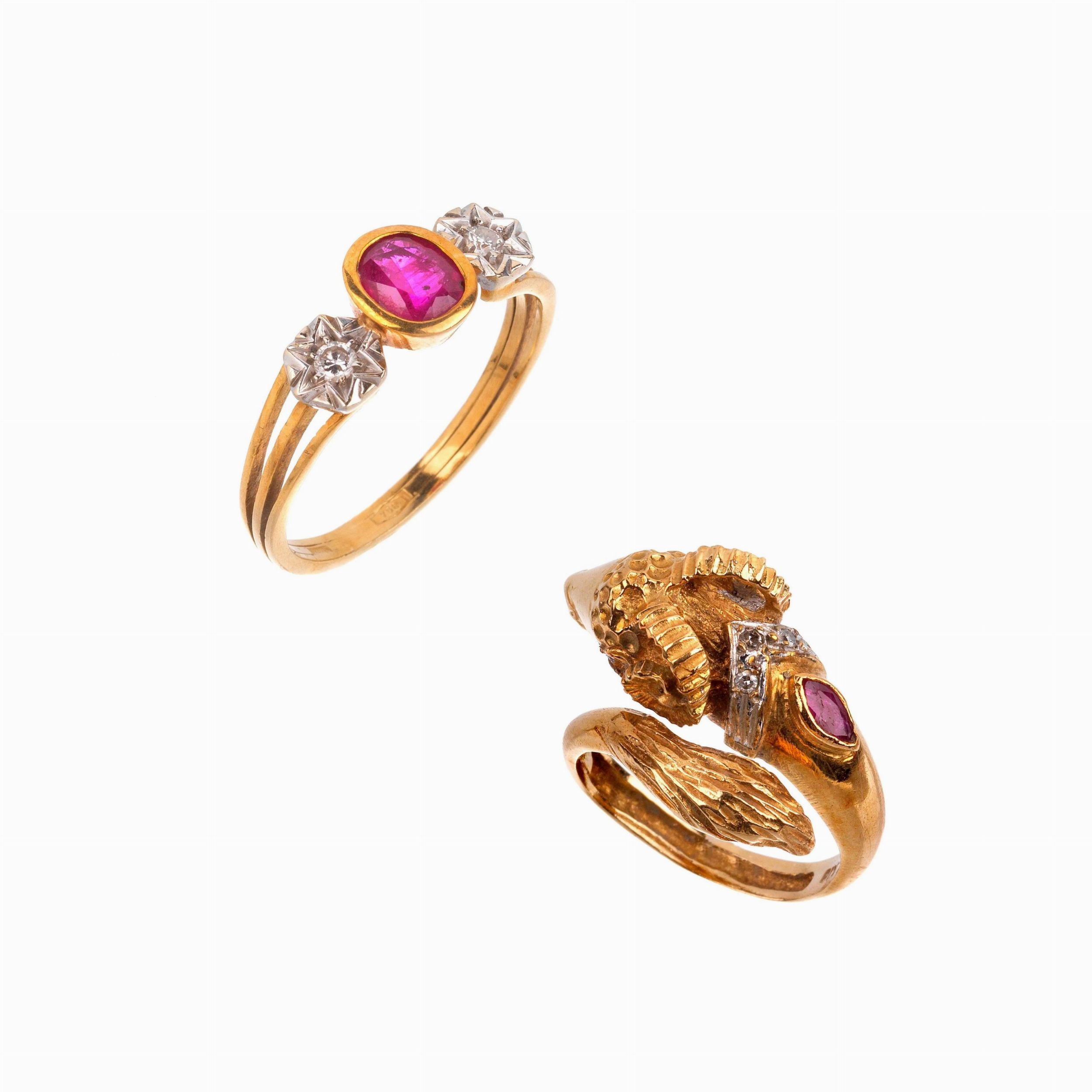 di cui uno in oro giallo e bianco 18kt, impreziosito al centro da un rubino taglio ovale di ct 0.50 circa, affiancato da due diamanti taglio brillante, punzoni 750 e del fabbricante, mis. 15/55; accompagnato da un piccolo anello a forma di ariete in oro giallo e bianco 18kt, impreziosito da rubini e diamanti, punzone 18kt, mis. 7/47, gr. 8 complessivi
