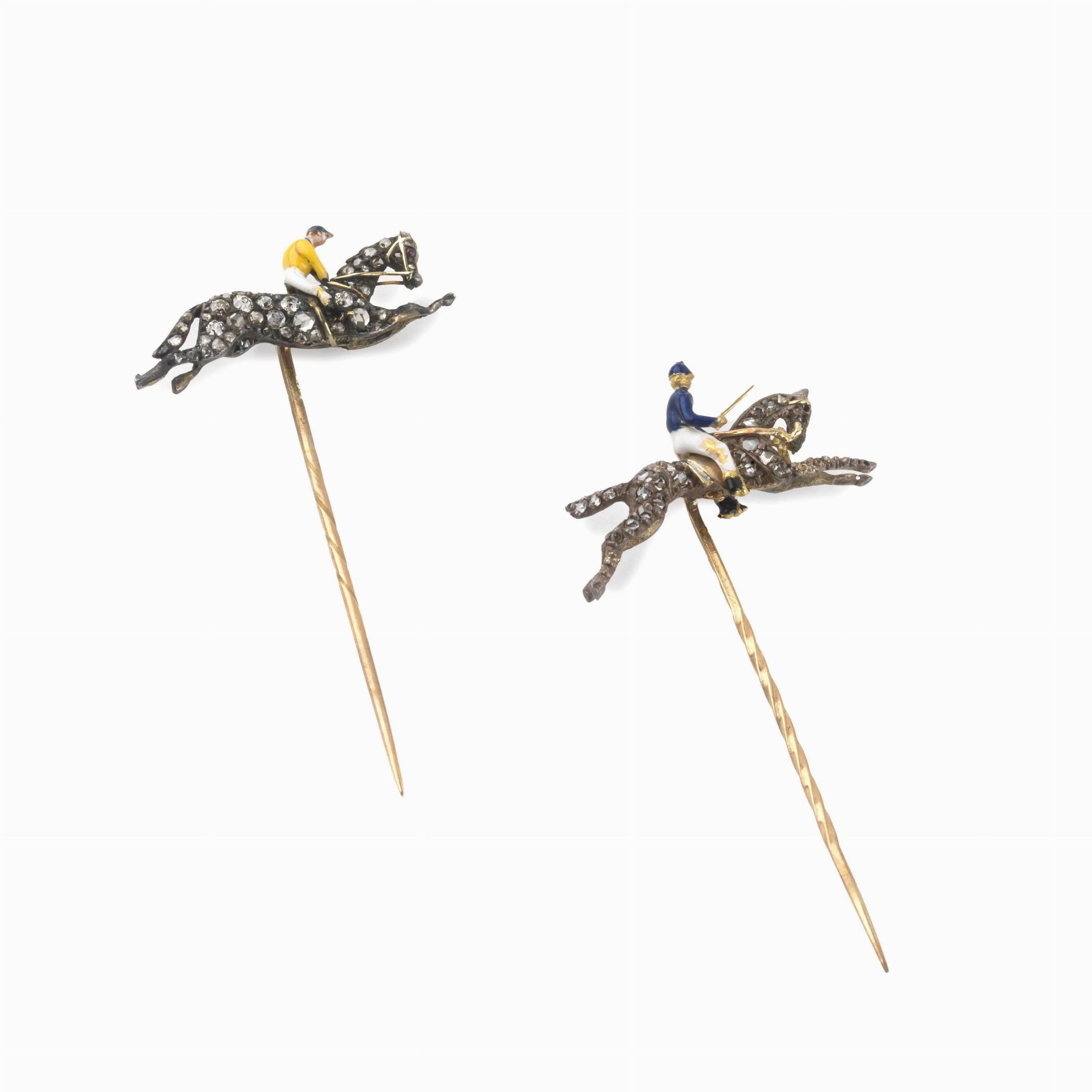 in argento e oro, decorate in smalto (difetti), sormontate da due fantini a cavallo, impreziosite da rose di diamante, dim. cm 3x6 circa, gr. 9 complessivi
