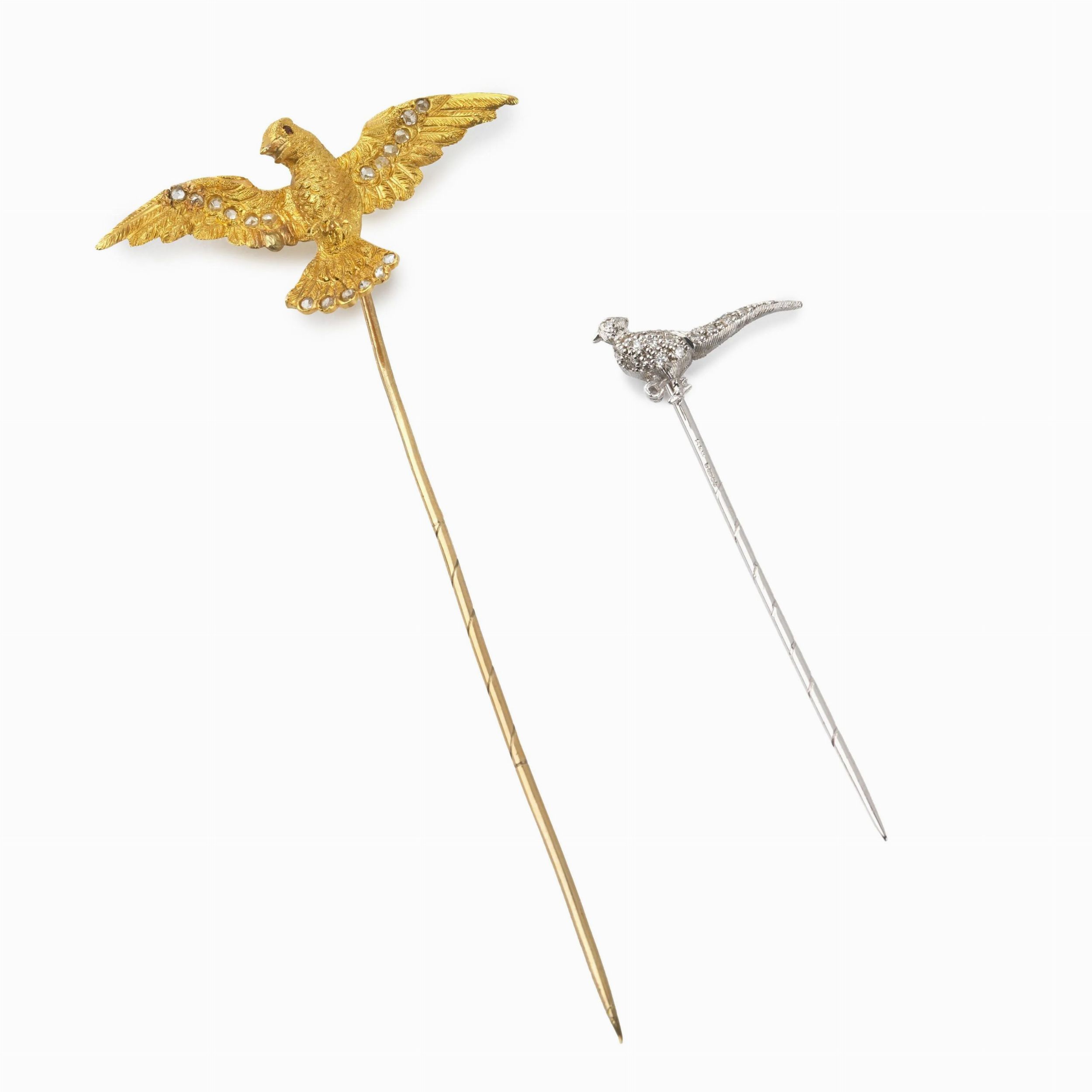 di cui una in oro giallo 18kt, sormontata da un'aquila impreziosita da rose di diamante, dim. cm 4,5x10; accompagnata da una seconda spilla in oro bianco 18kt, raffigurante un fagiano impreziosito da diamanti taglio huit huit, dim. cm 2x6, gr. 7 complessivi