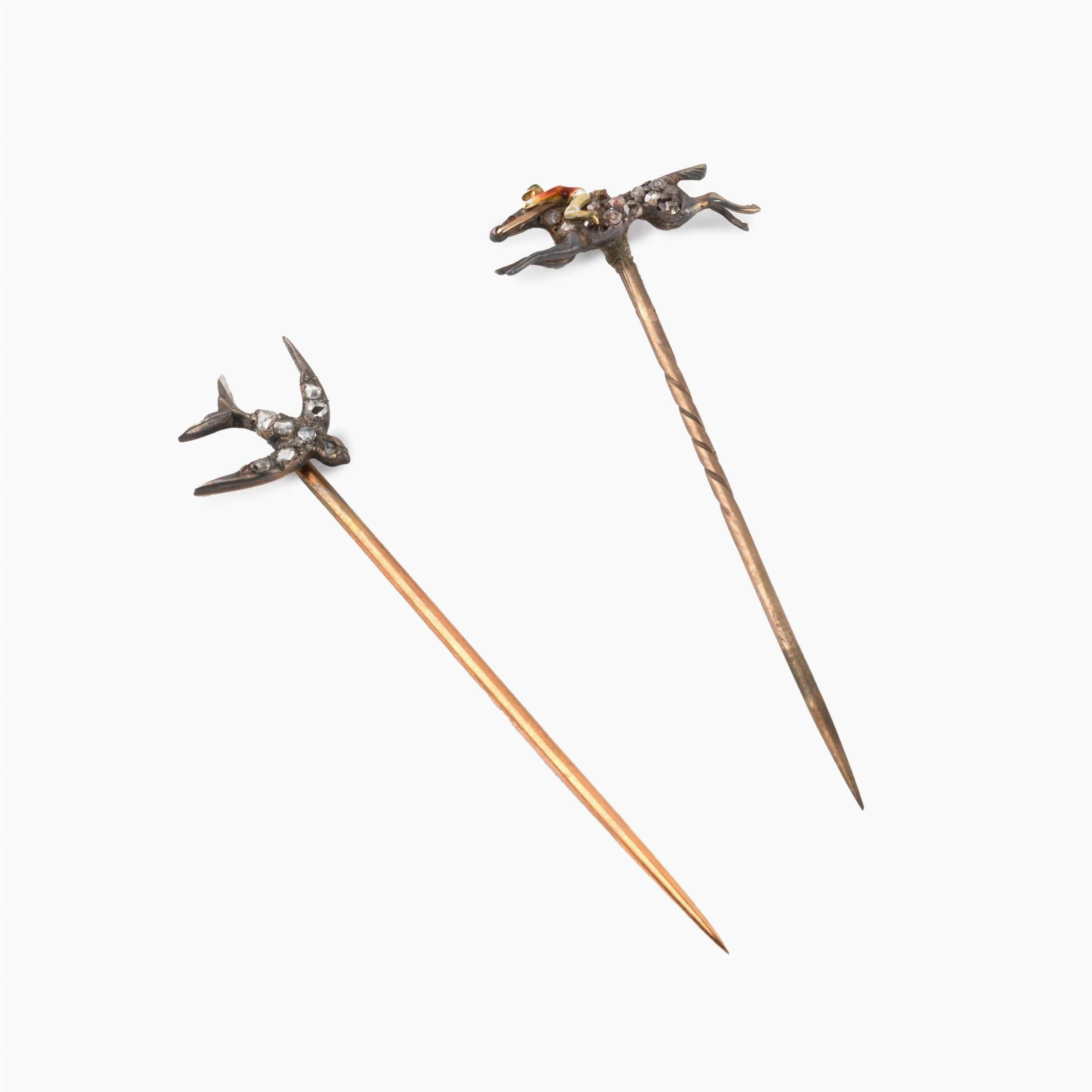 in argento e oro, di cui una sormontata da un fantino a cavallo (difetti), dim. cm 3x5,5; accompagnata da una seconda spilla con una rondine impreziosita da rose di diamante, dim. cm1x6, gr. 3 complessivi