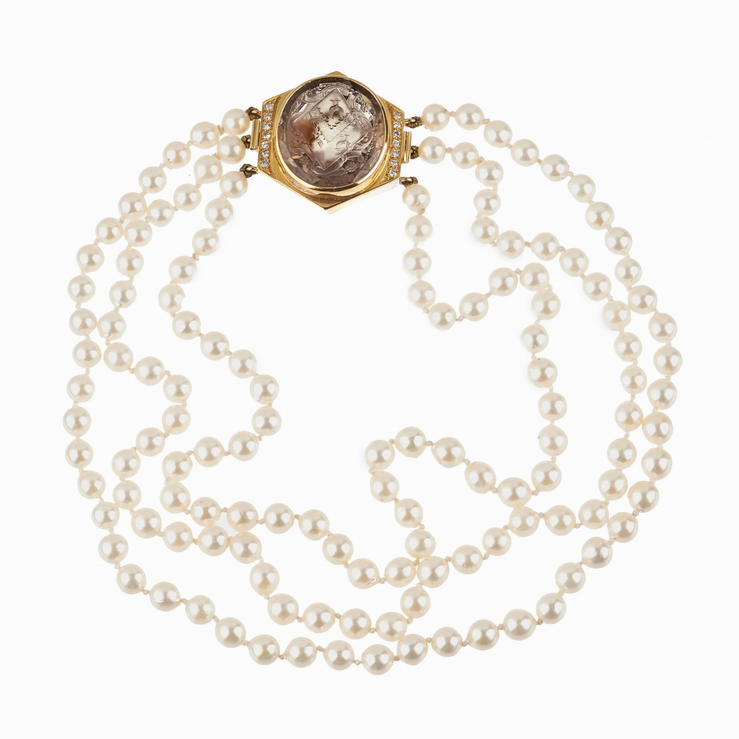 GIROCOLLO CON PERLE DIAMANTI E UN QUARZO INCISO