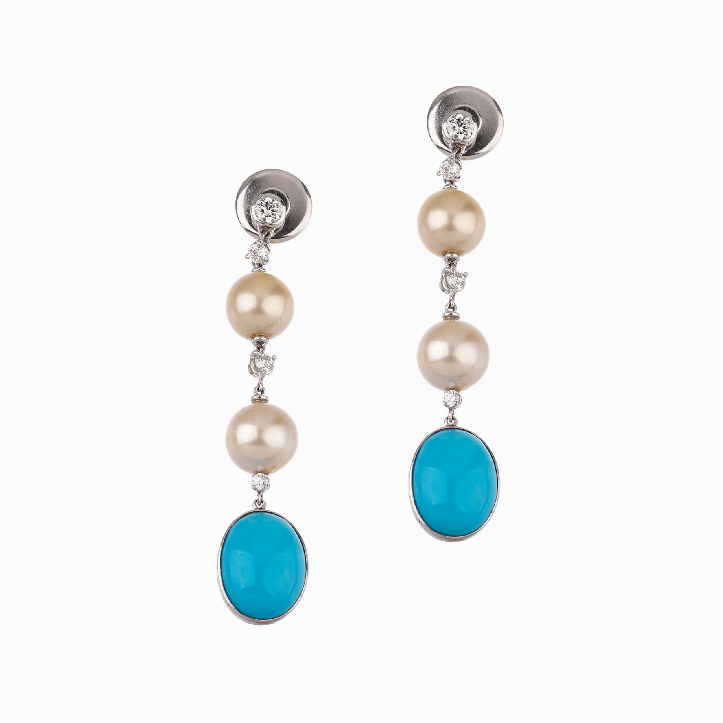 PAIO DI ORECCHINI PENDENTI CON PERLE PASTA DI TURCHESE E DIAMANTI
