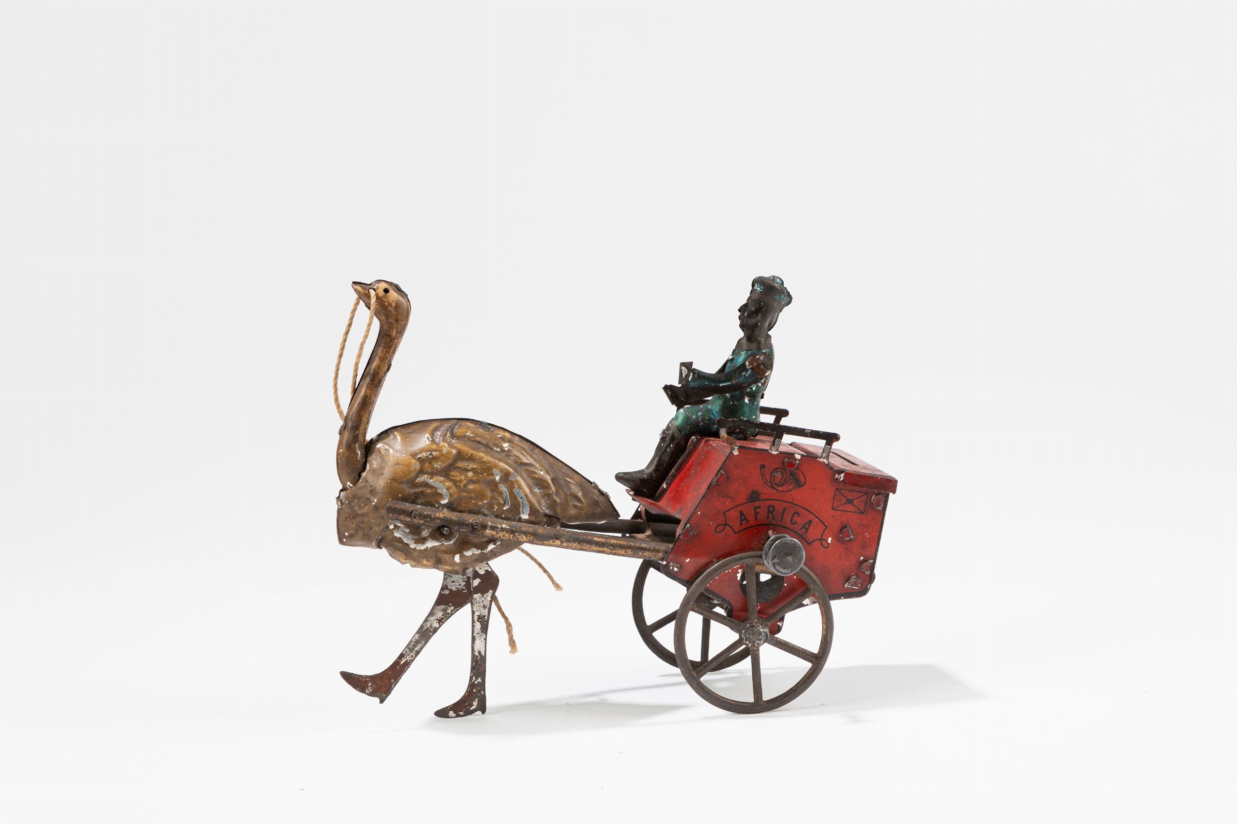 Mentre procede alza entrambe le braccia, una impugnante un frustino e l'altra le redini che, a loro volta, fanno muovere il collo dello struzzo