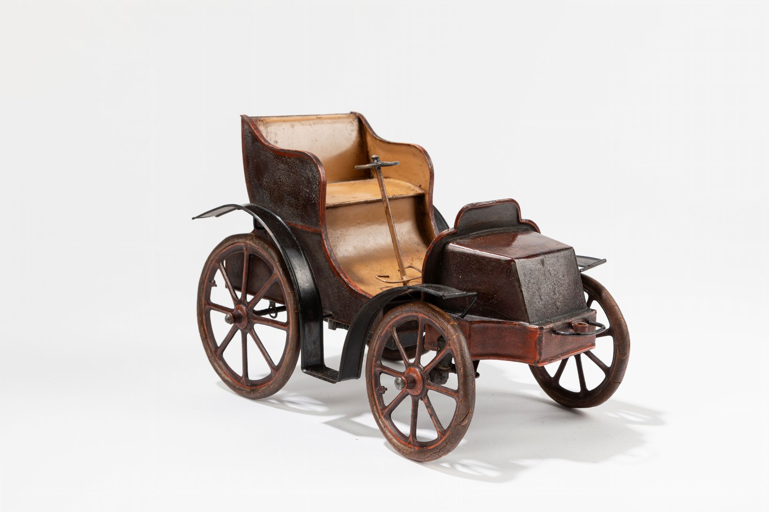 Dipinto a manoMeccanismo complesso, a molla funzionante, con ruote automaticamente sterzanti da puleggia collegata allo stesso, pneumatici in cacciùMancante lanterna luce centrale, condizioni eccellentiDimensioni cm 25Prodotto in Francia
