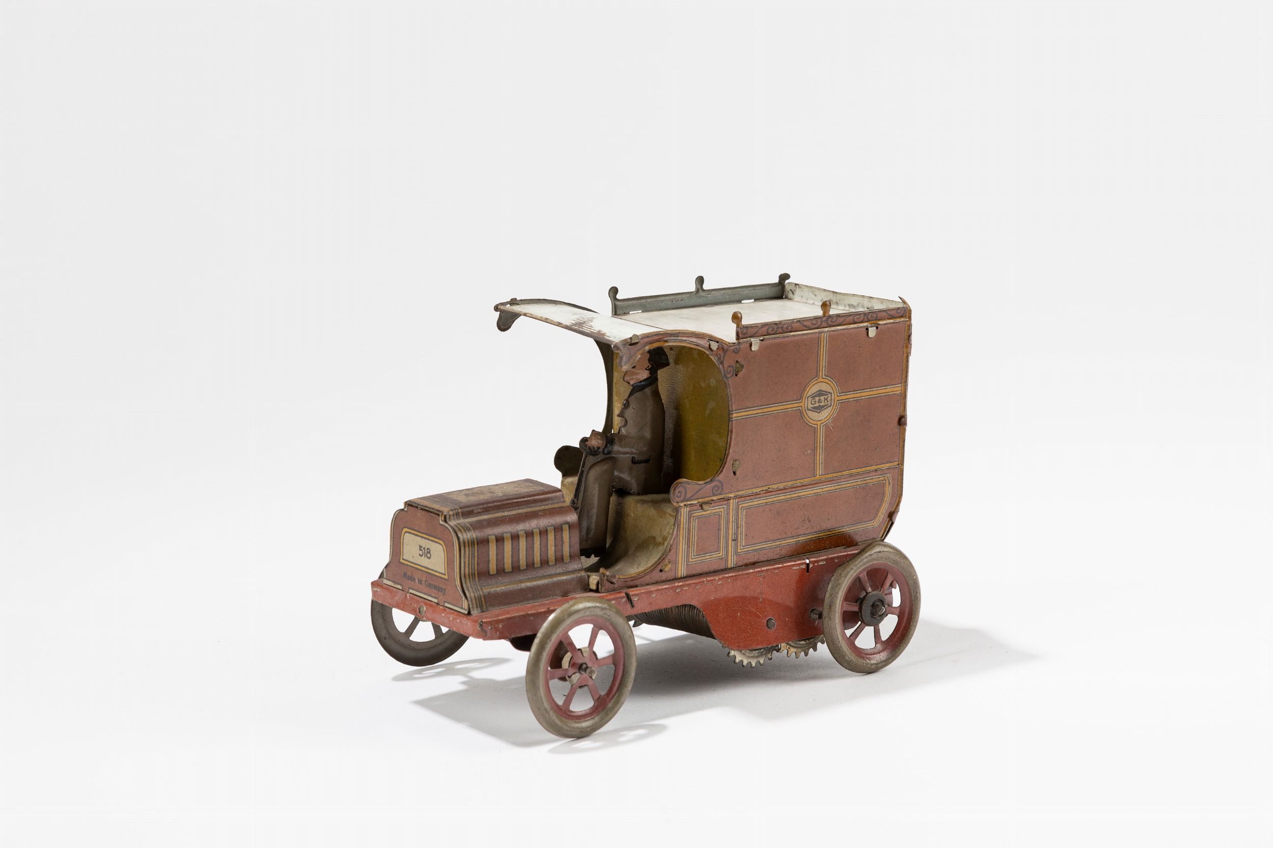 Latta litografataMeccanismo a molla (filo metallico attorcigliato) funzionante, condizioni buonePorte posteriori apribiliDimensioni cm 14Prodotto in Germania