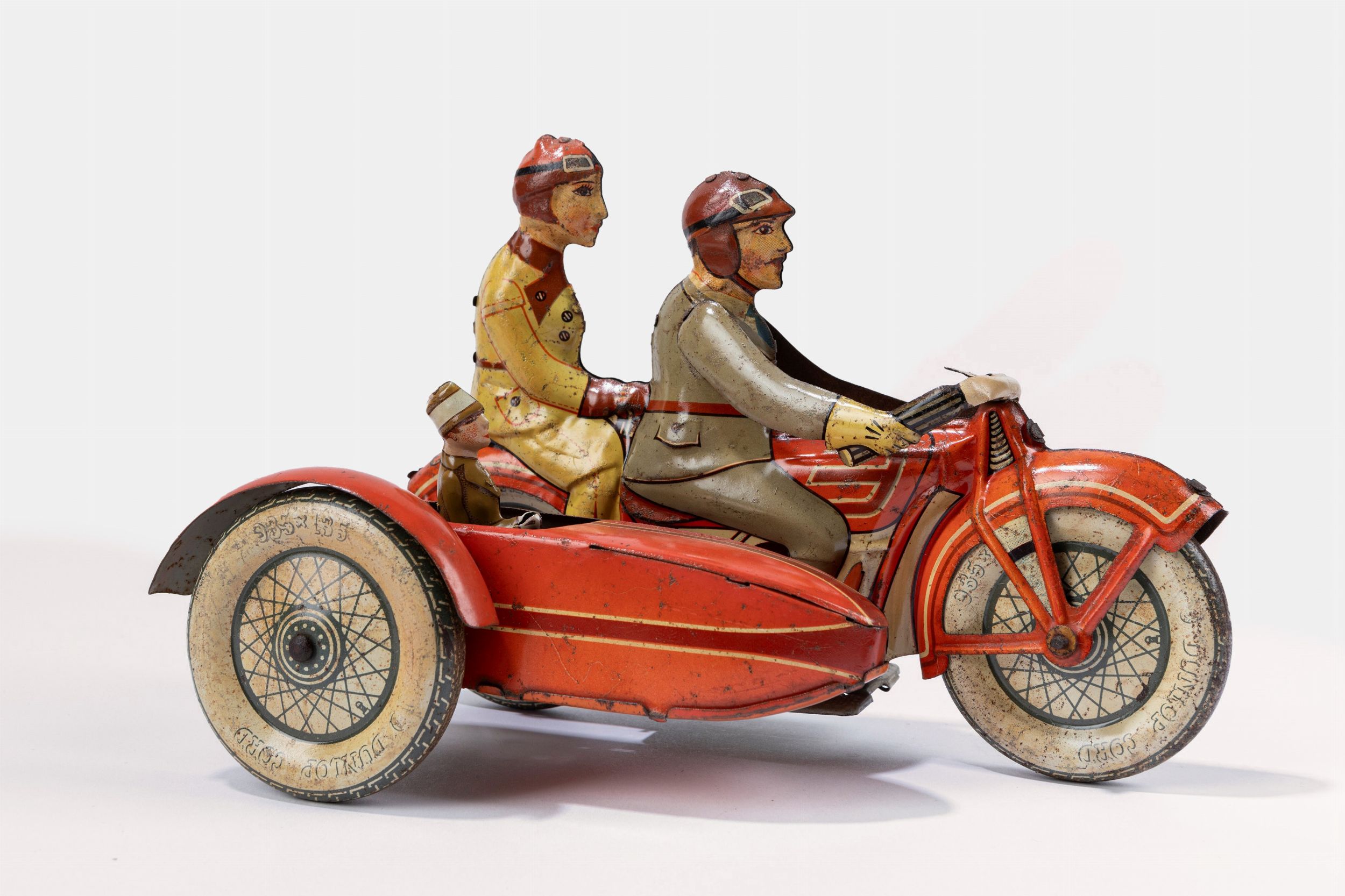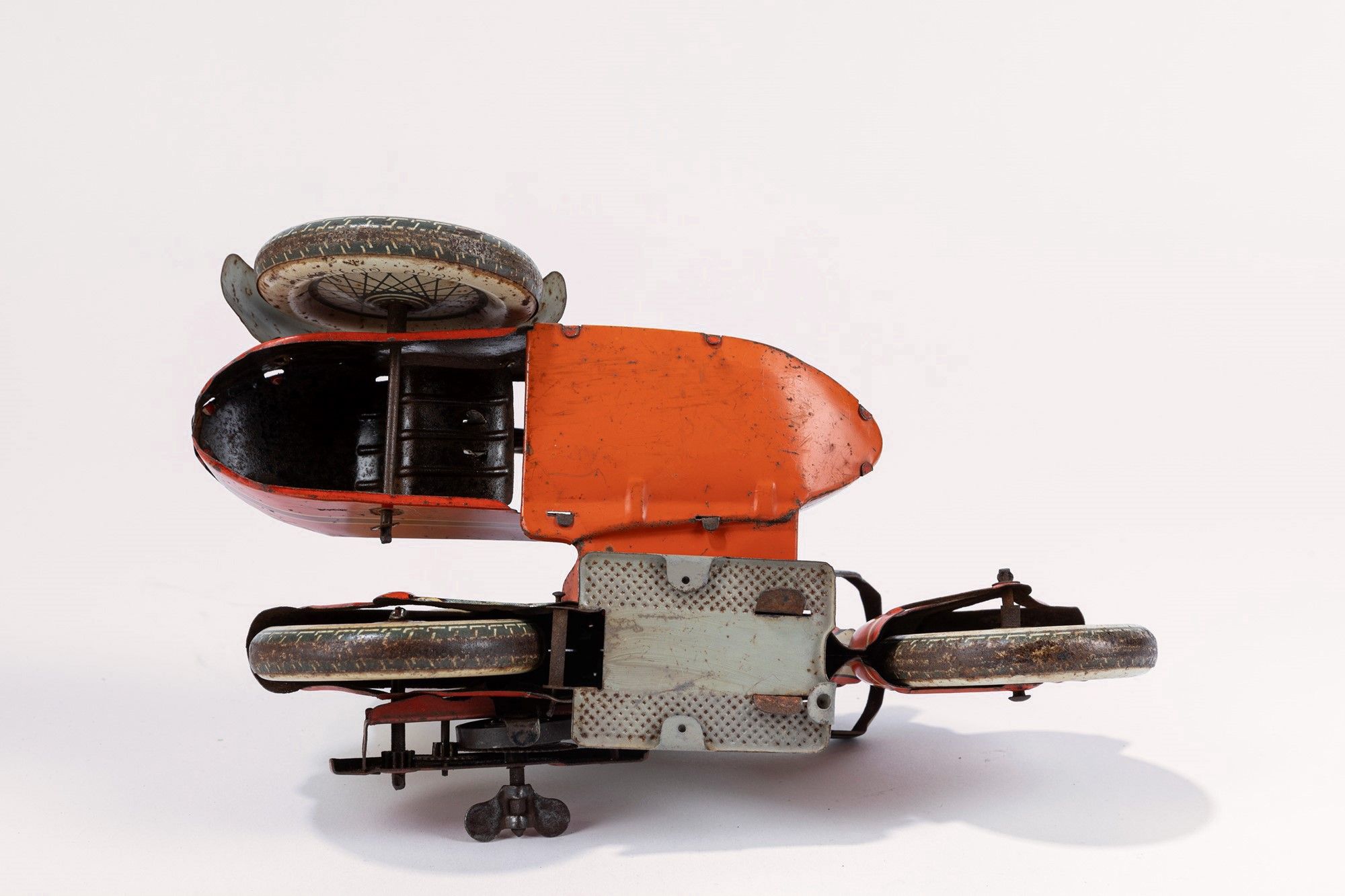 Lamiera litografata, con trasmissione a molla. Moto arancione, conducente vestito di beige, dietro di lui una donna con abito giallo, nel sidecar un ragazzo con vestito marrone.Dimensioni cm 26,5Ottime condizioniProdotto in Germania