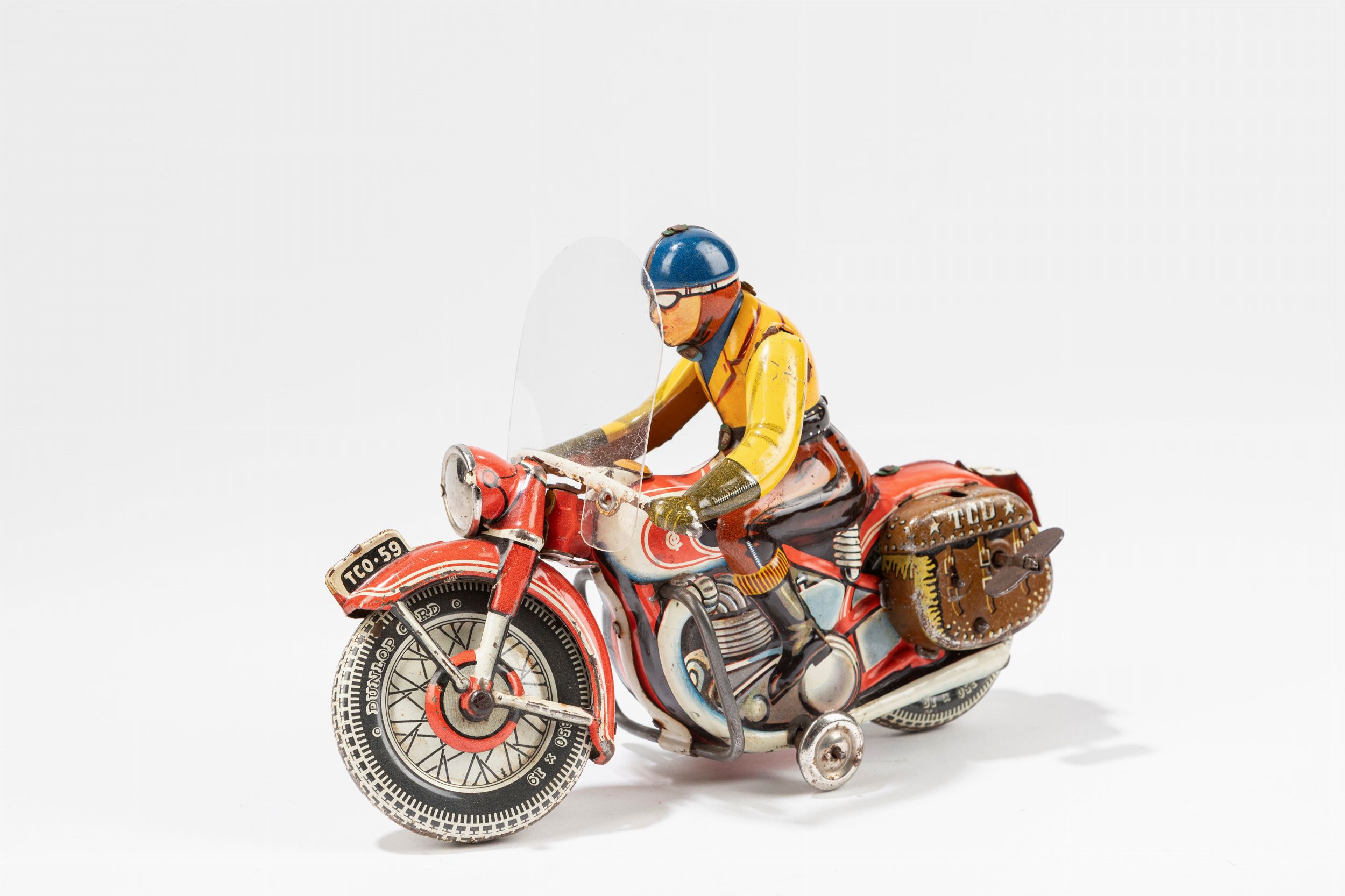 Latta litografataMeccanismo a molla funzionante, condizioni molto buoneParabrezza celluloide sostituitoDimensioni cm 18Prodotta in Germania