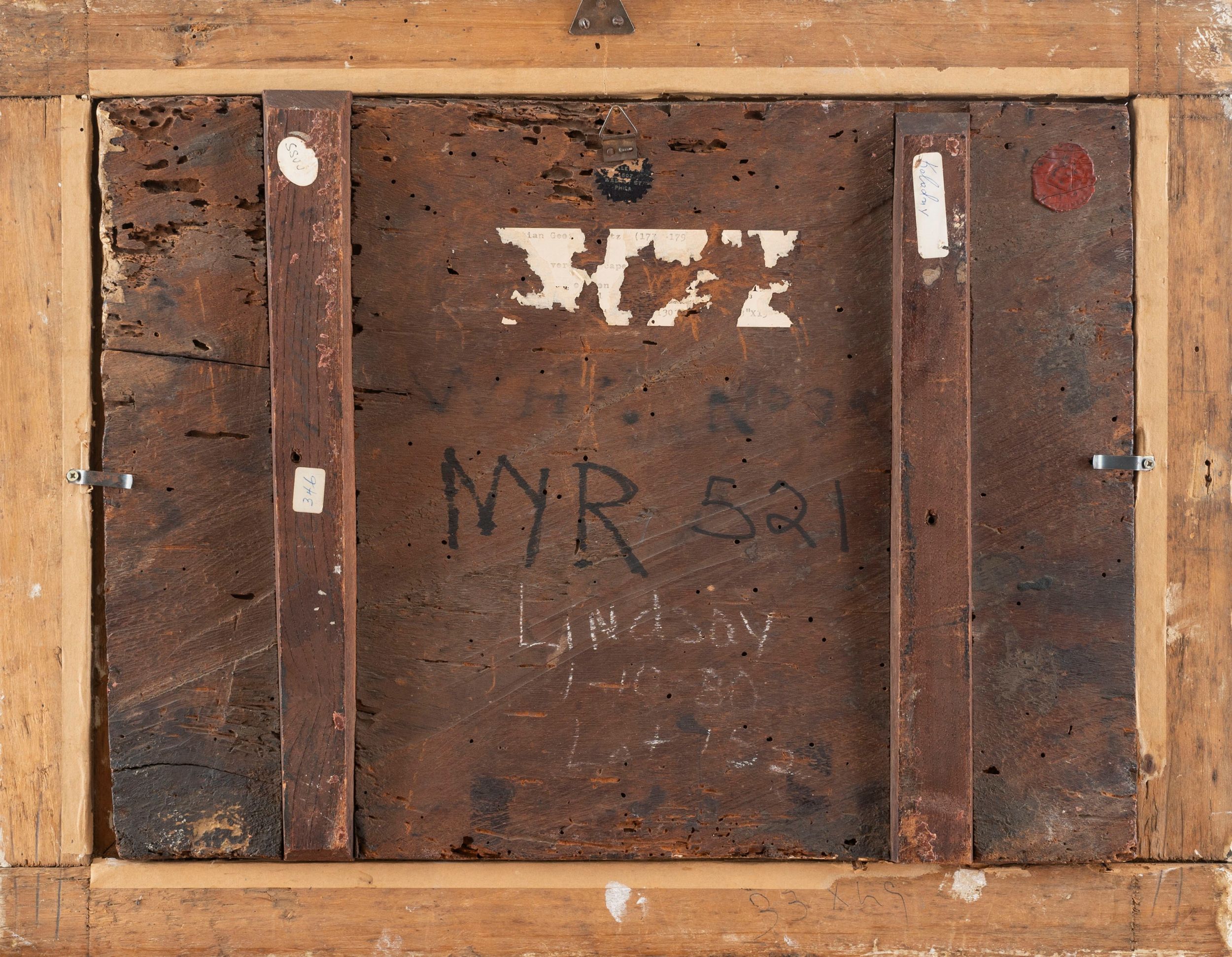 sul retro etichetta di collezione parzialmente leggibile con attribuzione a Christian Georg Schuetz  (1718-1791) e sigillo in ceralacca con stemma illegibile