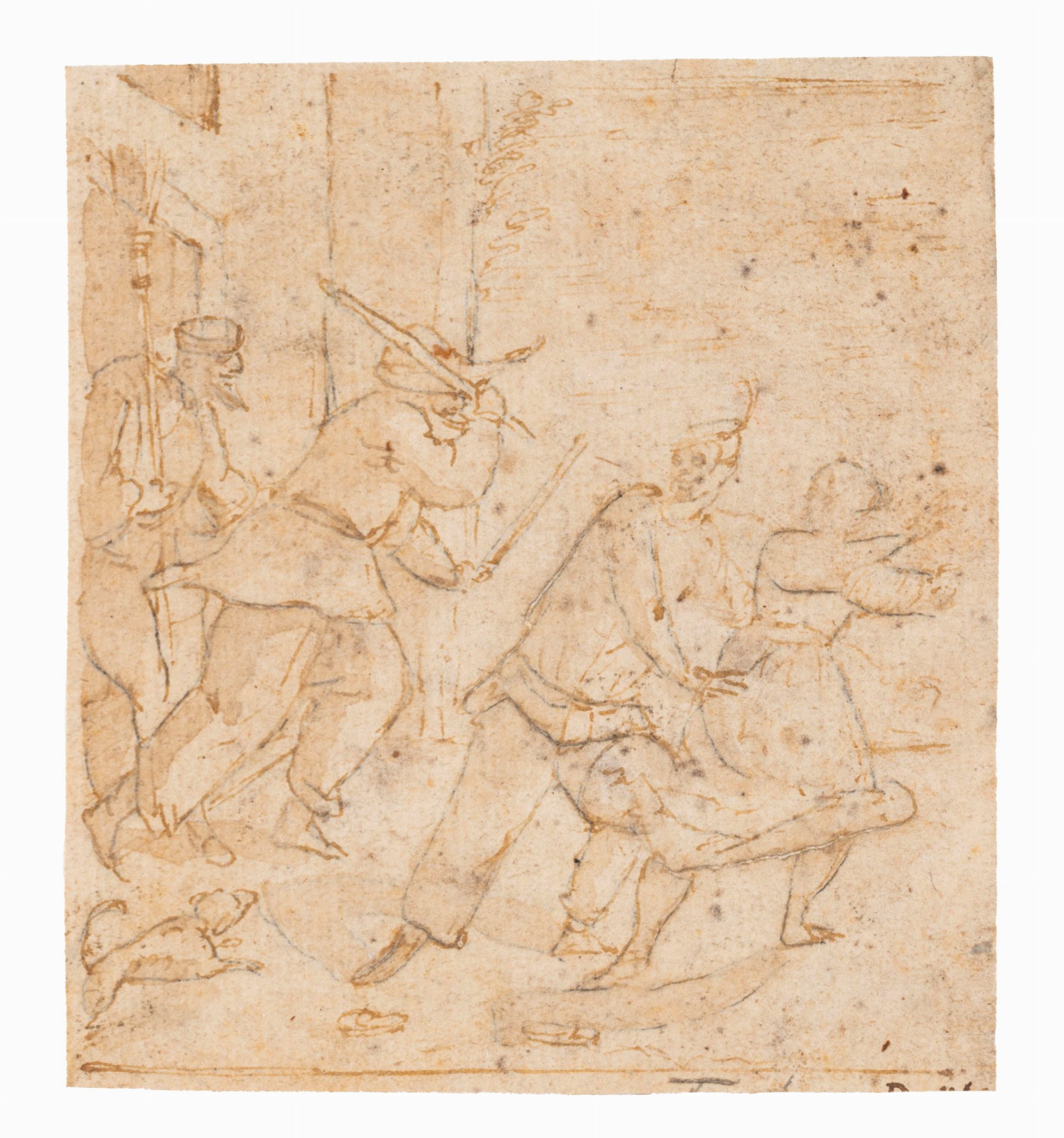 penna, inchiostro bruno e acquerello bruno su carta marroncina controfondata, mm 95 x 85