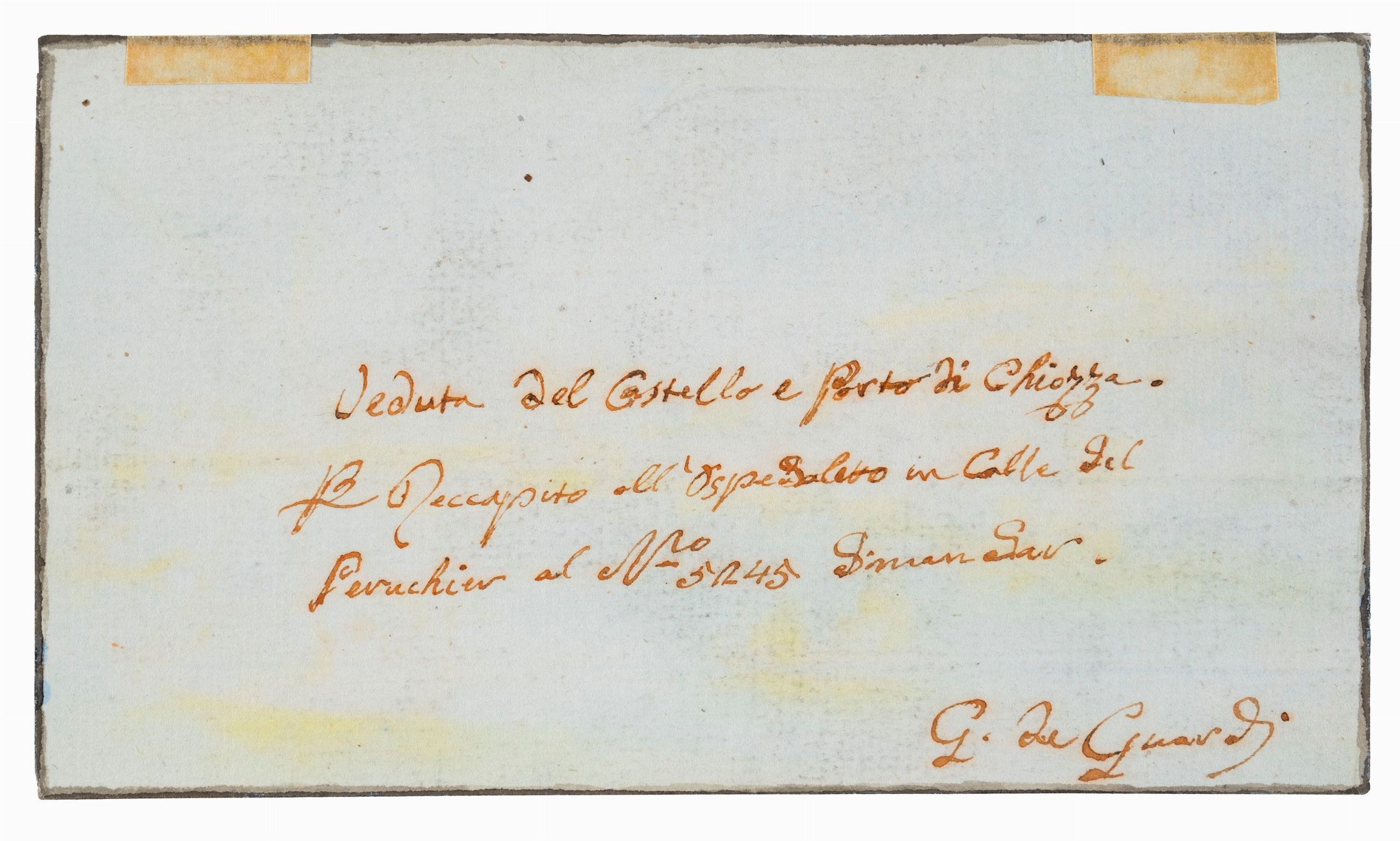 al verso antica iscrizione Veduta del Castello e Porto di Chiozza / (...) Reccapito all'Ospedaletto in Calle del Perucchier al n. 5245 (...) / G. de Guardi