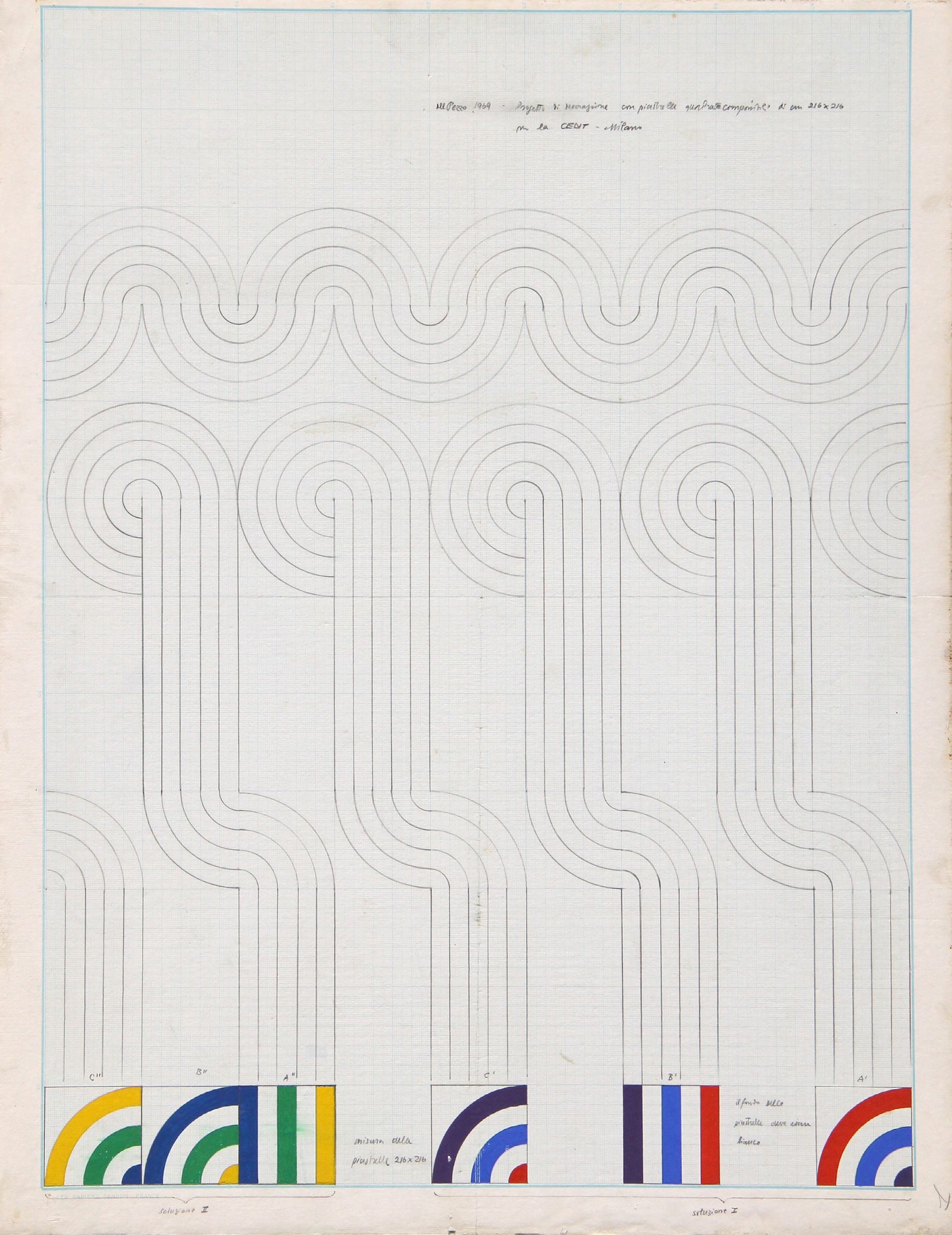 1969 Firma, data, titolo Del Pezzo, 1969, Progetto di decorazione con piastrelle quadrate componibili di cm 216x216 per la Cedit di Milano (in alto a destra)