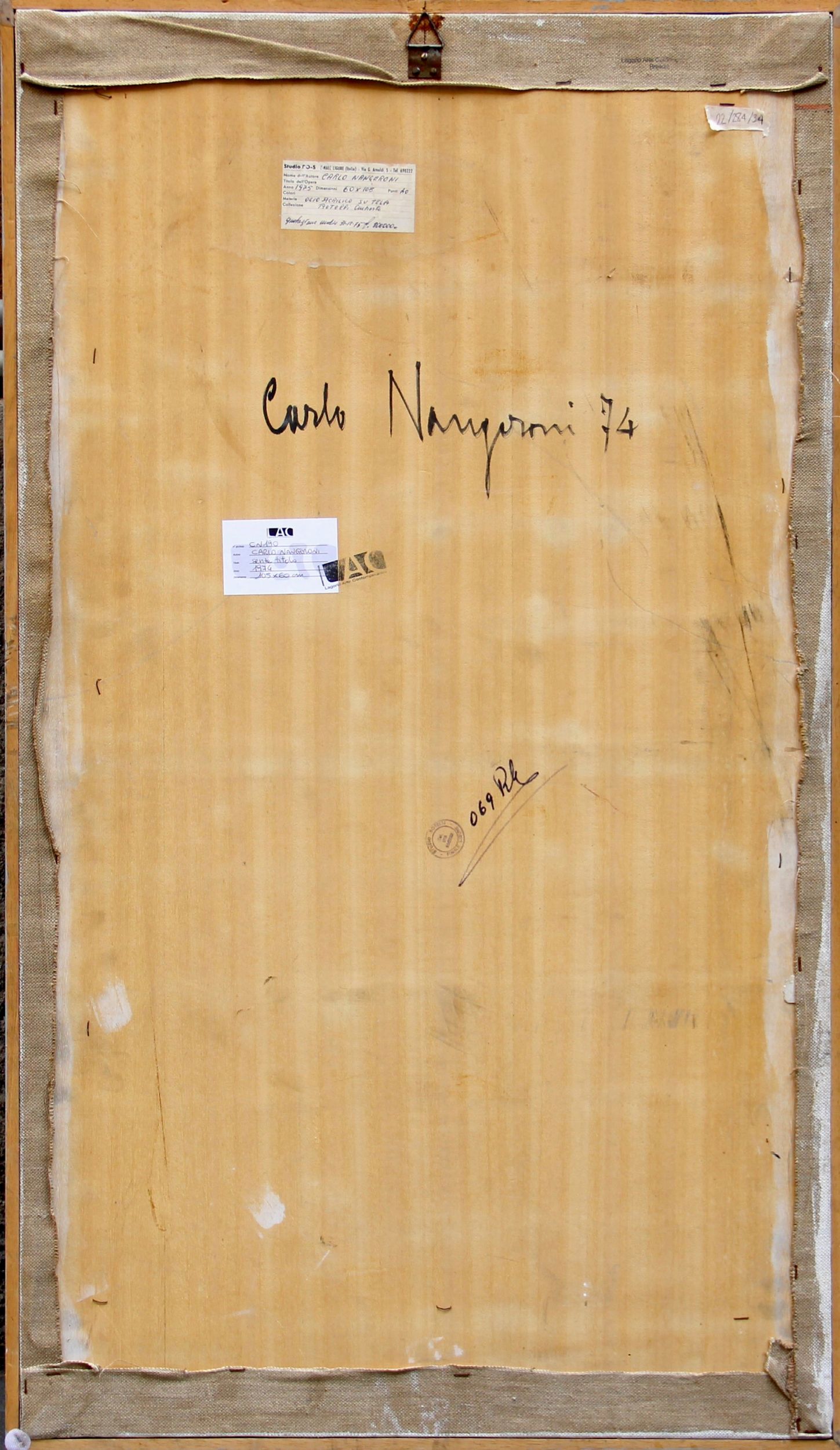 Firma, data Carlo Nangeroni, 74timbro di Studio Rotelli, Finale Ligure;etichetta di Studio RO-S, Finale Ligure;etichetta e timbro di di LAC – Lagorio Arte Contemporanea, Brescia (al retro)