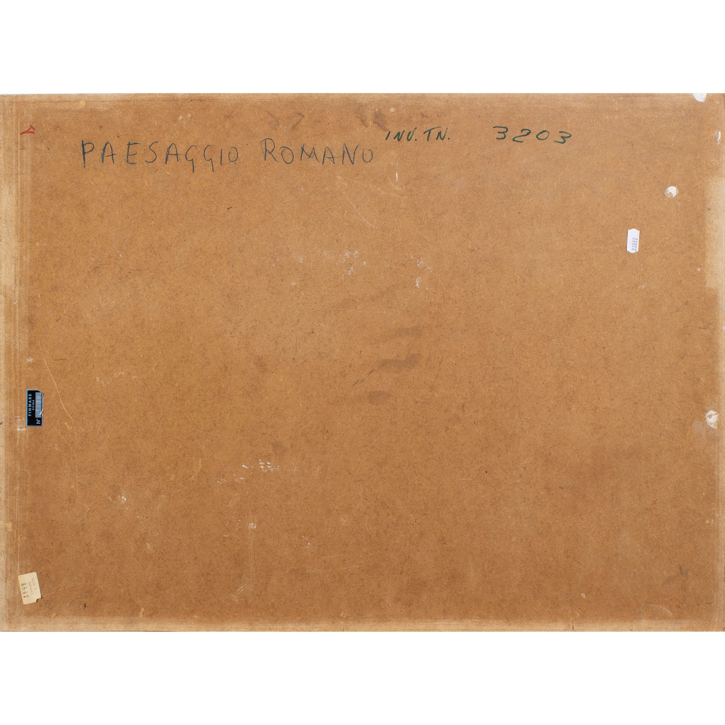 Atene 1891 - Roma 1952 'Paesaggio romano', 1949, tempera su faesite, firmata e datata in basso a sinistra, titolata sul retro, entro cornice. Bibliografia: Pia Vivarelli, Alberto Savinio. Catalogo generale, Electa, Milano, 1996, pag. 194, rif. 1949 6 IRI de Chirico: opere di Giorgio de Chirico e Alberto Savinio nelle collezioni d'arte dell'IRI, a cura della Direzione Centrale Affari Generali e Relazioni Esterne dell'IRI, catalogo realizzato in occasione delle giornate di studio \'Nulla sine tragoedia gloria\', Roma 1988; Il palazzo e la collezione d'arte della Tirrenia, a cura di Nicola Spinosa, Electa Napoli, Napoli 2001, pag. 84, n. 25